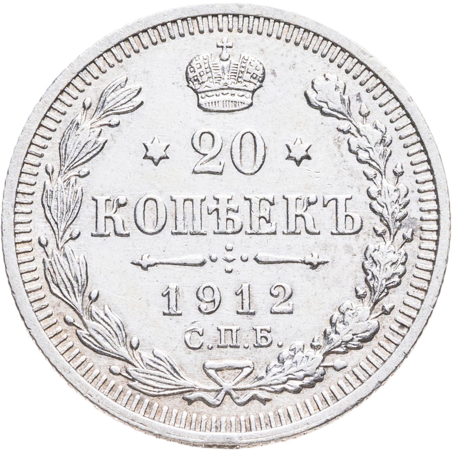 В центре указан номинал - цифра «20», ограниченная с обеих сторон звездочками. Над цифрой – Корона Российской империи. Под цифрой номинала — слово "КОПЕЕК". Ниже, расположен декоративный разделитель в виде двух разнонаправленных фигурных линий и стилизованным из точек крестом между ними. Под разделителем — дата выпуска монеты «1912». Под цифрой даты — обозначение монетного двора «С.П.Б.». Вдоль канта, не доходя до короны, изображен венок из лавровой и дубовой ветвей, которые, в нижней части, перевязаны лентой на узел бантом. По окружности канта имеются рельефные элементы, выполненные в виде зубцов.