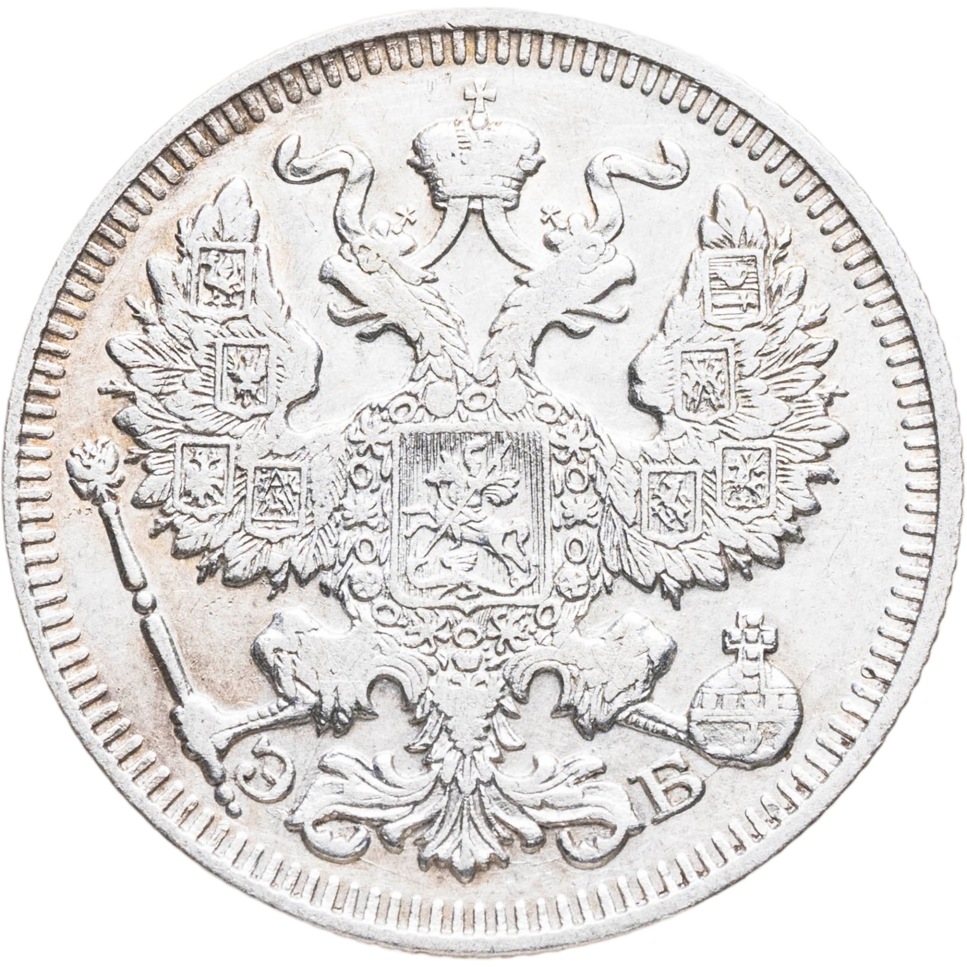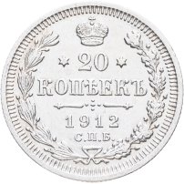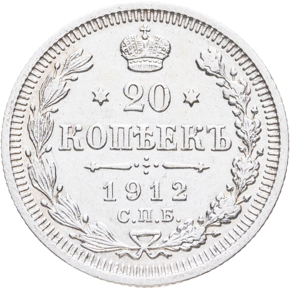 В центре указан номинал - цифра «20», ограниченная с обеих сторон звездочками. Над цифрой – Корона Российской империи. Под цифрой номинала — слово "КОПЕЕК". Ниже, расположен декоративный разделитель в виде двух разнонаправленных фигурных линий и стилизованным из точек крестом между ними. Под разделителем — дата выпуска монеты «1912». Под цифрой даты — обозначение монетного двора «С.П.Б.». Вдоль канта, не доходя до короны, изображен венок из лавровой и дубовой ветвей, которые, в нижней части, перевязаны лентой на узел бантом. По окружности канта имеются рельефные элементы, выполненные в виде зубцов.