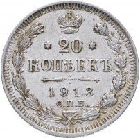 В центре указан номинал - цифра «20», ограниченная с обеих сторон звездочками. Над цифрой – Корона Российской империи. Под цифрой номинала — слово "КОПЕЕК". Ниже, расположен декоративный разделитель в виде двух разнонаправленных фигурных линий и стилизованным из точек крестом между ними. Под разделителем — дата выпуска монеты «1913». Под цифрой даты — обозначение монетного двора «С.П.Б.». Вдоль канта, не доходя до короны, изображен венок из лавровой и дубовой ветвей, которые, в нижней части, перевязаны лентой на узел бантом. По окружности канта имеются рельефные элементы, выполненные в виде зубцов.