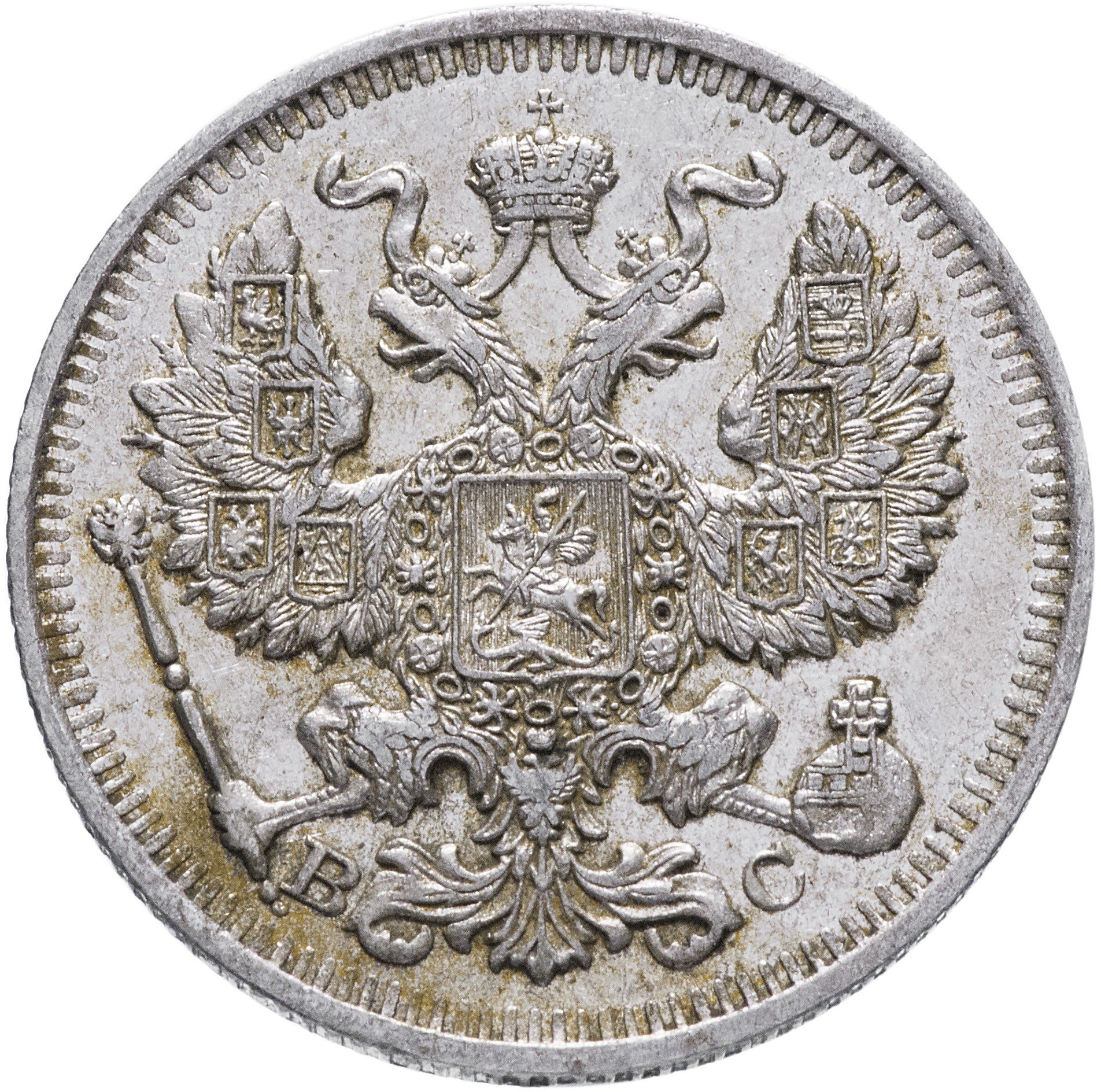 В центре изображен Малый Государственный Герб Российской империи - двуглавый орёл, головы которого увенчаны двумя коронами, третья, большая корона над ними. Все они соединены орденской лентой ордена Св. Апостола Андрея Первозванного. На груди орла расположен Московский герб - щит с изображением Георгия Победоносца, поражающего копьем дракона. Вокруг щита цепь ордена Св. Апостола Андрея Первозванного. На крыльях изображены гербы: Царства Казанского, Польского, Херсонеса Таврического, Астраханского, Сибирского, Грузинского и герб соединенных княжеств Киевского, Новгородского и Владимирского — по 4 на каждое крыло. В правой лапе орла – скипетр, в левой – держава. Под правой лапой – буква «В», под левой – буква «С». Инициалы минцмейстера Виктора Смирнова. По окружности канта имеются рельефные элементы, выполненные в виде зубцов.