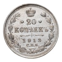 В центре указан номинал - цифра «20», ограниченная с обеих сторон звездочками. Над цифрой – Корона Российской империи. Под цифрой номинала — слово "КОПЕЕК". Ниже, расположен декоративный разделитель в виде двух разнонаправленных фигурных линий и стилизованным из точек крестом между ними. Под разделителем — дата выпуска монеты «1913». Под цифрой даты — обозначение монетного двора «С.П.Б.». Вдоль канта, не доходя до короны, изображен венок из лавровой и дубовой ветвей, которые, в нижней части, перевязаны лентой на узел бантом. По окружности канта имеются рельефные элементы, выполненные в виде зубцов.