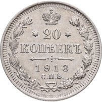 В центре указан номинал - цифра «20», ограниченная с обеих сторон звездочками. Над цифрой – Корона Российской империи. Под цифрой номинала — слово "КОПЕЕК". Ниже, расположен декоративный разделитель в виде двух разнонаправленных фигурных линий и стилизованным из точек крестом между ними. Под разделителем — дата выпуска монеты «1913». Под цифрой даты — обозначение монетного двора «С.П.Б.». Вдоль канта, не доходя до короны, изображен венок из лавровой и дубовой ветвей, которые, в нижней части, перевязаны лентой на узел бантом. По окружности канта имеются рельефные элементы, выполненные в виде зубцов.