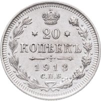 В центре указан номинал - цифра «20», ограниченная с обеих сторон звездочками. Над цифрой – Корона Российской империи. Под цифрой номинала — слово "КОПЕЕК". Ниже, расположен декоративный разделитель в виде двух разнонаправленных фигурных линий и стилизованным из точек крестом между ними. Под разделителем — дата выпуска монеты «1913». Под цифрой даты — обозначение монетного двора «С.П.Б.». Вдоль канта, не доходя до короны, изображен венок из лавровой и дубовой ветвей, которые, в нижней части, перевязаны лентой на узел бантом. По окружности канта имеются рельефные элементы, выполненные в виде зубцов.