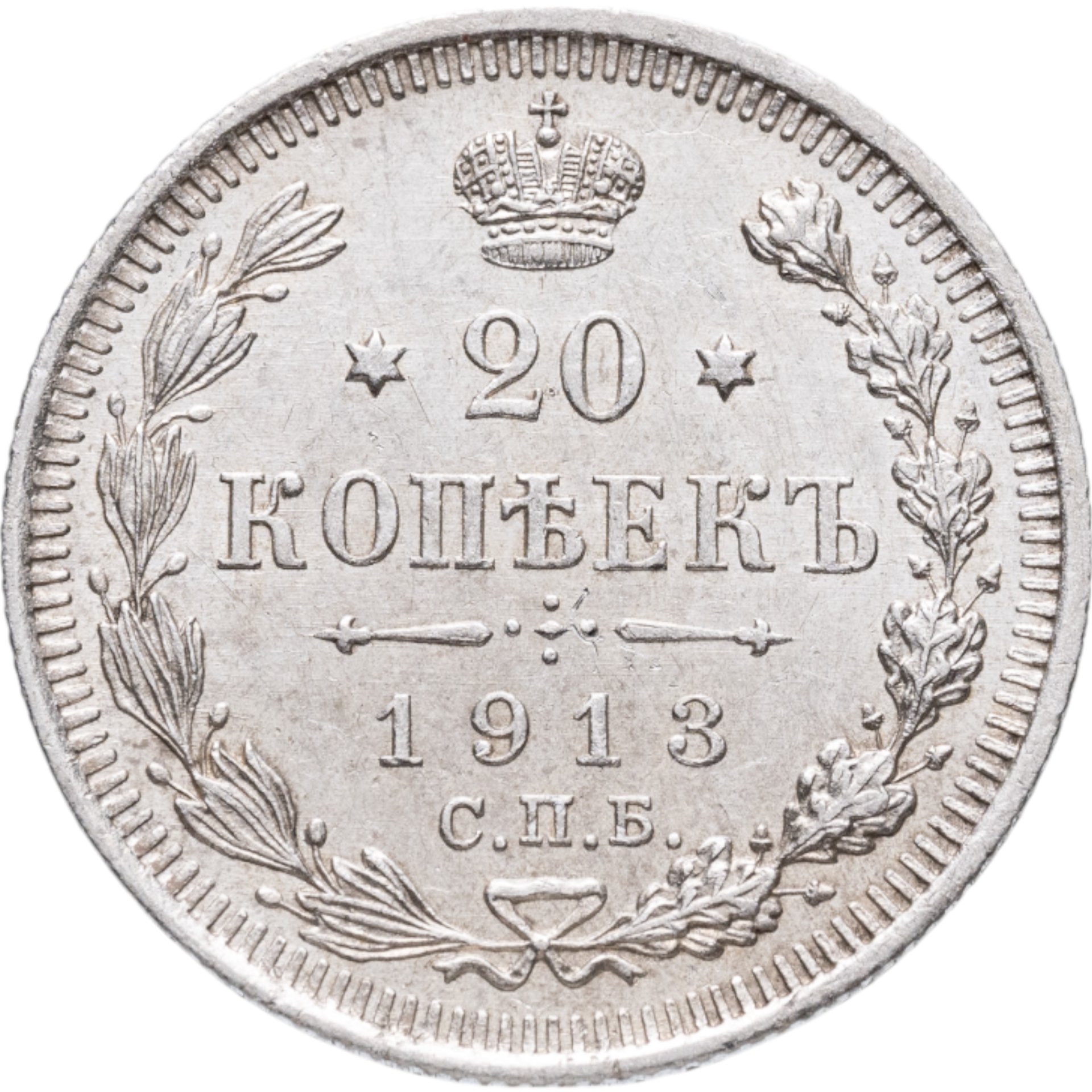 В центре указан номинал - цифра «20», ограниченная с обеих сторон звездочками. Над цифрой – Корона Российской империи. Под цифрой номинала — слово "КОПЕЕК". Ниже, расположен декоративный разделитель в виде двух разнонаправленных фигурных линий и стилизованным из точек крестом между ними. Под разделителем — дата выпуска монеты «1913». Под цифрой даты — обозначение монетного двора «С.П.Б.». Вдоль канта, не доходя до короны, изображен венок из лавровой и дубовой ветвей, которые, в нижней части, перевязаны лентой на узел бантом. По окружности канта имеются рельефные элементы, выполненные в виде зубцов.