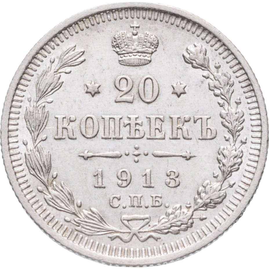 В центре указан номинал - цифра «20», ограниченная с обеих сторон звездочками. Над цифрой – Корона Российской империи. Под цифрой номинала — слово "КОПЕЕК". Ниже, расположен декоративный разделитель в виде двух разнонаправленных фигурных линий и стилизованным из точек крестом между ними. Под разделителем — дата выпуска монеты «1913». Под цифрой даты — обозначение монетного двора «С.П.Б.». Вдоль канта, не доходя до короны, изображен венок из лавровой и дубовой ветвей, которые, в нижней части, перевязаны лентой на узел бантом. По окружности канта имеются рельефные элементы, выполненные в виде зубцов.