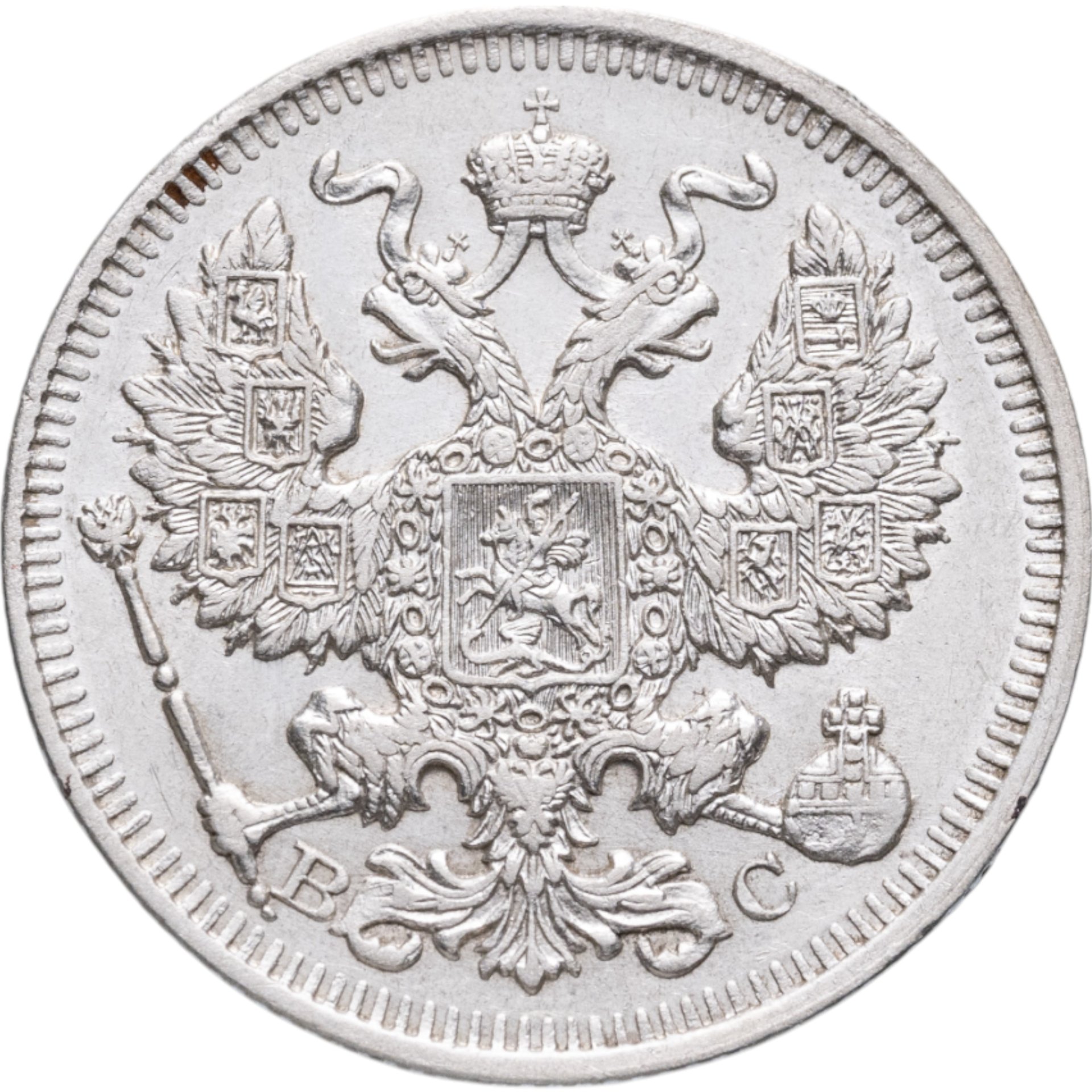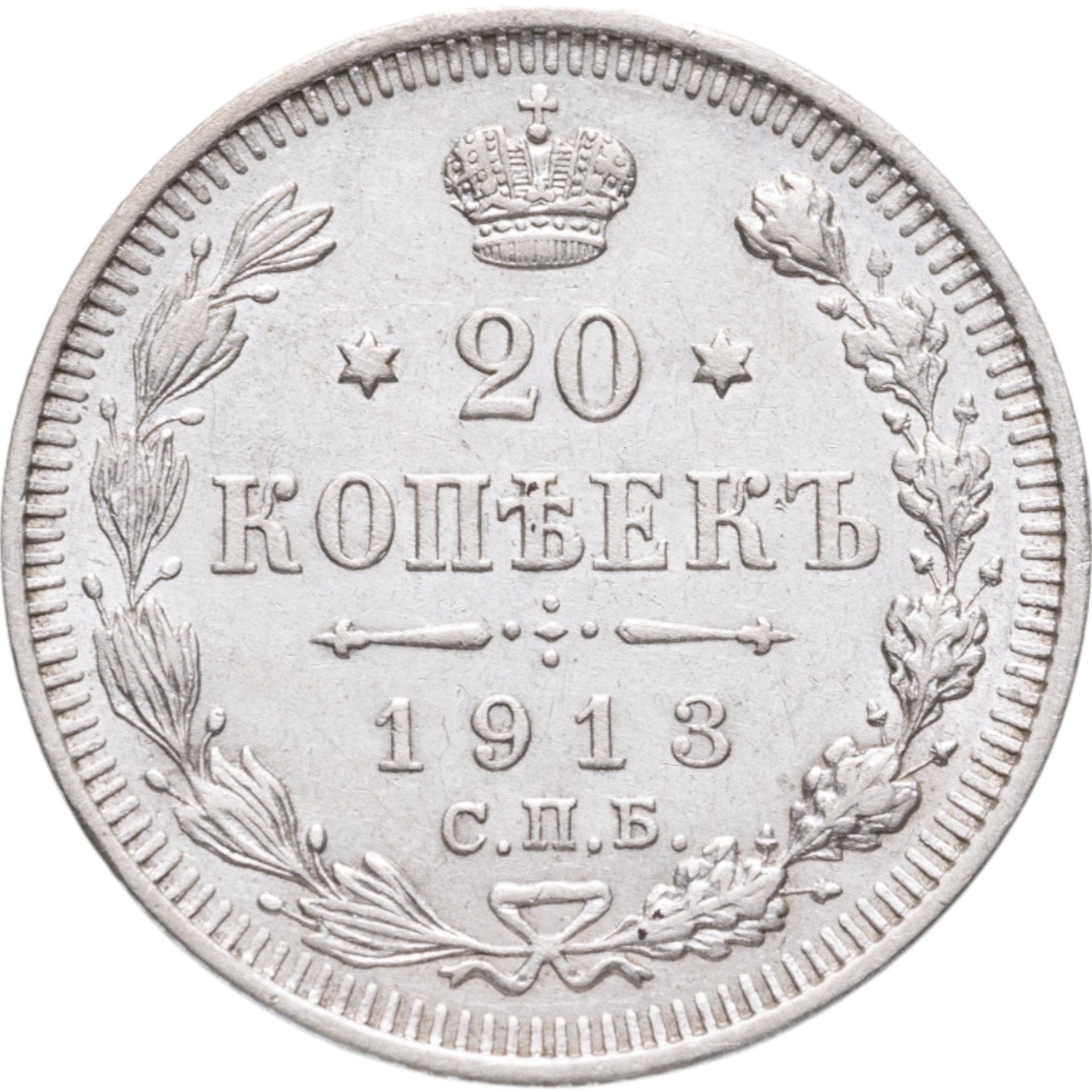 В центре указан номинал - цифра «20», ограниченная с обеих сторон звездочками. Над цифрой – Корона Российской империи. Под цифрой номинала — слово "КОПЕЕК". Ниже, расположен декоративный разделитель в виде двух разнонаправленных фигурных линий и стилизованным из точек крестом между ними. Под разделителем — дата выпуска монеты «1913». Под цифрой даты — обозначение монетного двора «С.П.Б.». Вдоль канта, не доходя до короны, изображен венок из лавровой и дубовой ветвей, которые, в нижней части, перевязаны лентой на узел бантом. По окружности канта имеются рельефные элементы, выполненные в виде зубцов.