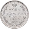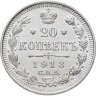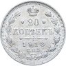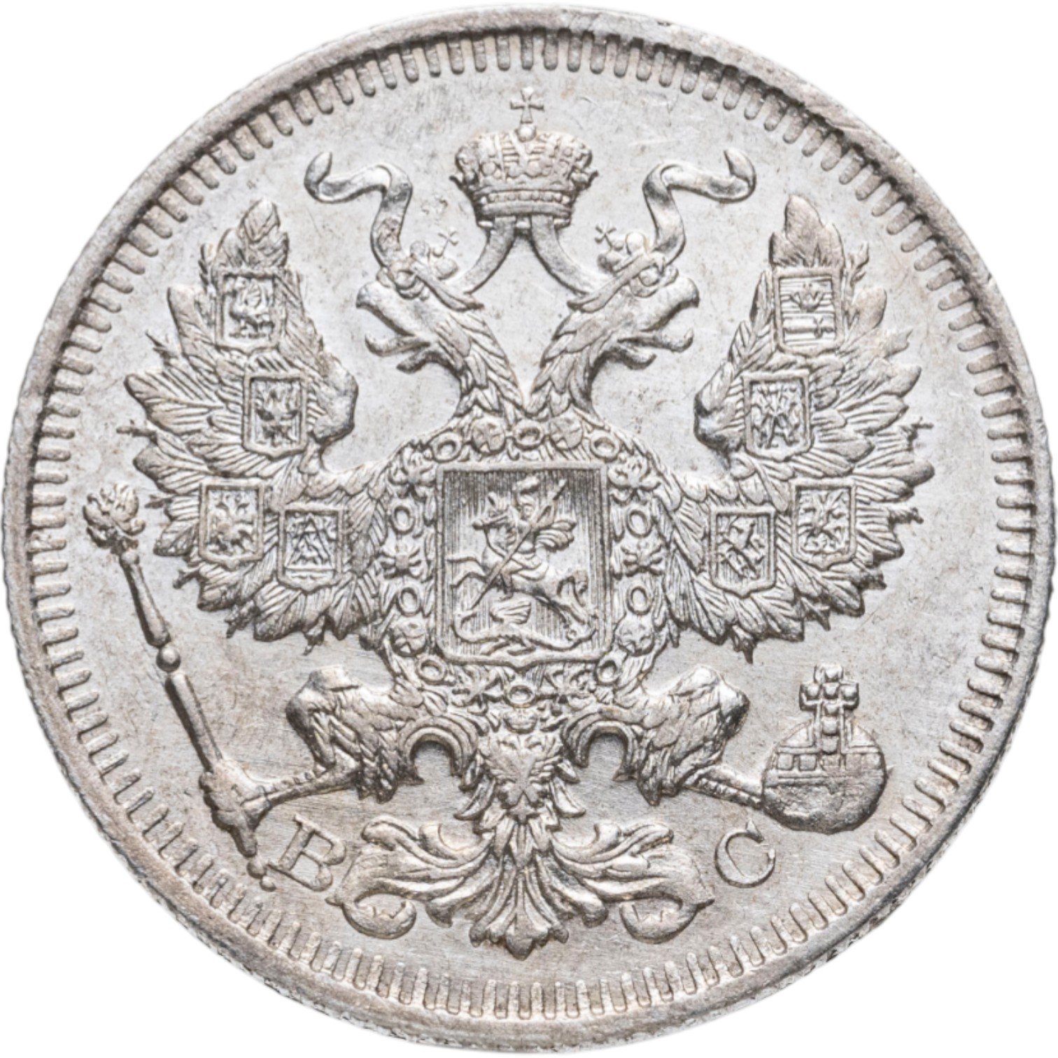 В центре указан номинал - цифра «20», ограниченная с обеих сторон звездочками. Над цифрой – Корона Российской империи. Под цифрой номинала — слово "КОПЕЕК". Ниже, расположен декоративный разделитель в виде двух разнонаправленных фигурных линий и стилизованным из точек крестом между ними. Под разделителем — дата выпуска монеты «1914». Под цифрой даты — обозначение монетного двора «С.П.Б.». Вдоль канта, не доходя до короны, изображен венок из лавровой и дубовой ветвей, которые, в нижней части, перевязаны лентой на узел бантом. По окружности канта имеются рельефные элементы, выполненные в виде зубцов.