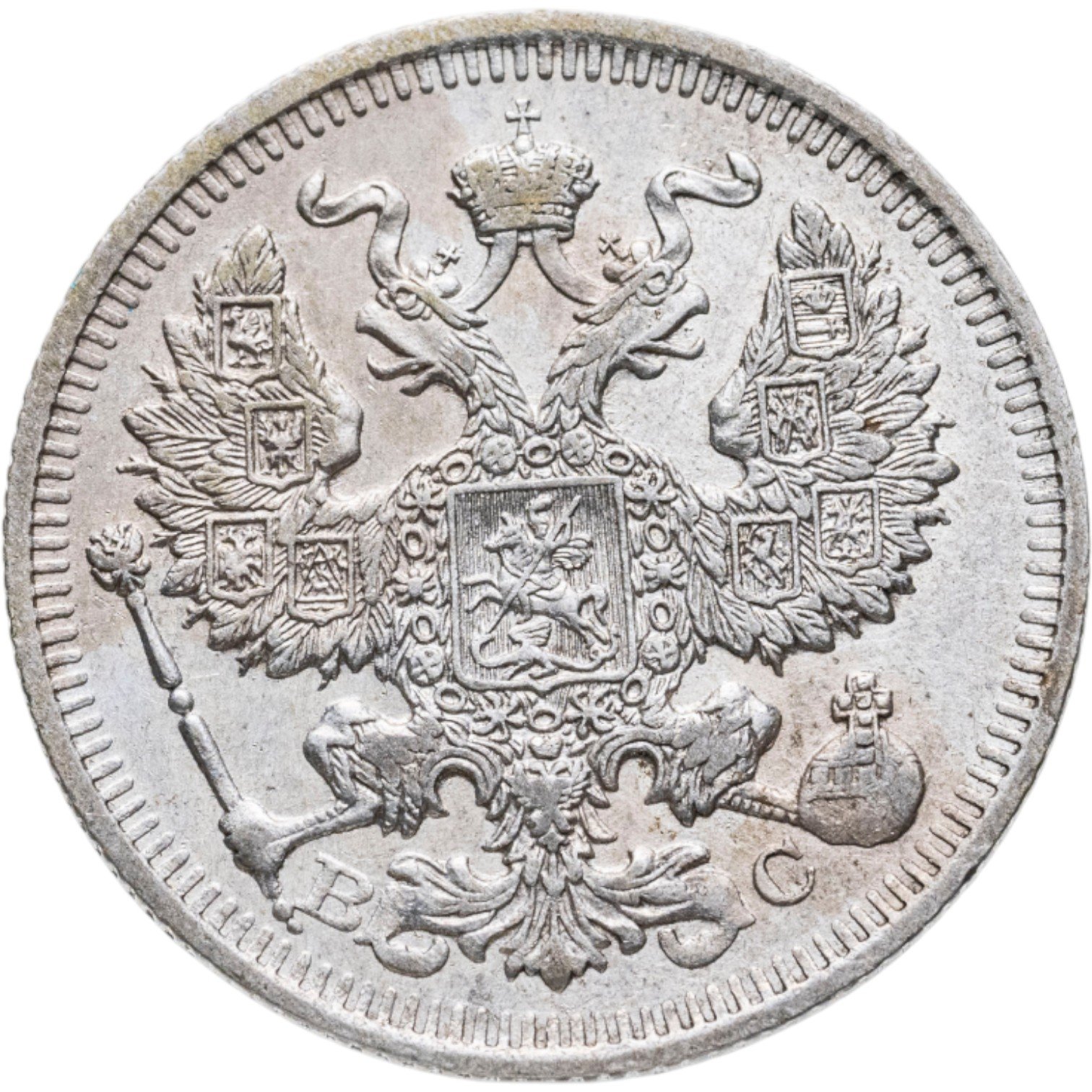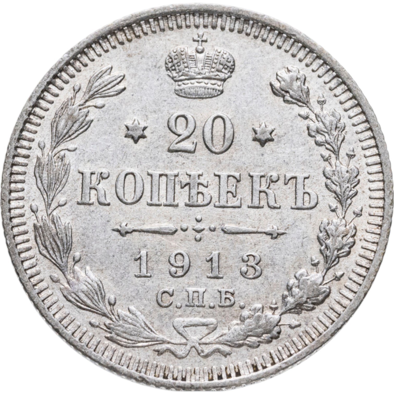 В центре указан номинал - цифра «20», ограниченная с обеих сторон звездочками. Над цифрой – Корона Российской империи. Под цифрой номинала — слово "КОПЕЕК". Ниже, расположен декоративный разделитель в виде двух разнонаправленных фигурных линий и стилизованным из точек крестом между ними. Под разделителем — дата выпуска монеты «1913». Под цифрой даты — обозначение монетного двора «С.П.Б.». Вдоль канта, не доходя до короны, изображен венок из лавровой и дубовой ветвей, которые, в нижней части, перевязаны лентой на узел бантом. По окружности канта имеются рельефные элементы, выполненные в виде зубцов.