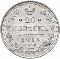 В центре указан номинал - цифра «20», ограниченная с обеих сторон звездочками. Над цифрой – Корона Российской империи. Под цифрой номинала — слово "КОПЕЕК". Ниже, расположен декоративный разделитель в виде двух разнонаправленных фигурных линий и стилизованным из точек крестом между ними. Под разделителем — дата выпуска монеты «1914». Под цифрой даты — обозначение монетного двора «С.П.Б.». Вдоль канта, не доходя до короны, изображен венок из лавровой и дубовой ветвей, которые, в нижней части, перевязаны лентой на узел бантом. По окружности канта имеются рельефные элементы, выполненные в виде зубцов.
