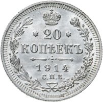 В центре указан номинал - цифра «20», ограниченная с обеих сторон звездочками. Над цифрой – Корона Российской империи. Под цифрой номинала — слово "КОПЕЕК". Ниже, расположен декоративный разделитель в виде двух разнонаправленных фигурных линий и стилизованным из точек крестом между ними. Под разделителем — дата выпуска монеты «1914». Под цифрой даты — обозначение монетного двора «С.П.Б.». Вдоль канта, не доходя до короны, изображен венок из лавровой и дубовой ветвей, которые, в нижней части, перевязаны лентой на узел бантом. По окружности канта имеются рельефные элементы, выполненные в виде зубцов.
