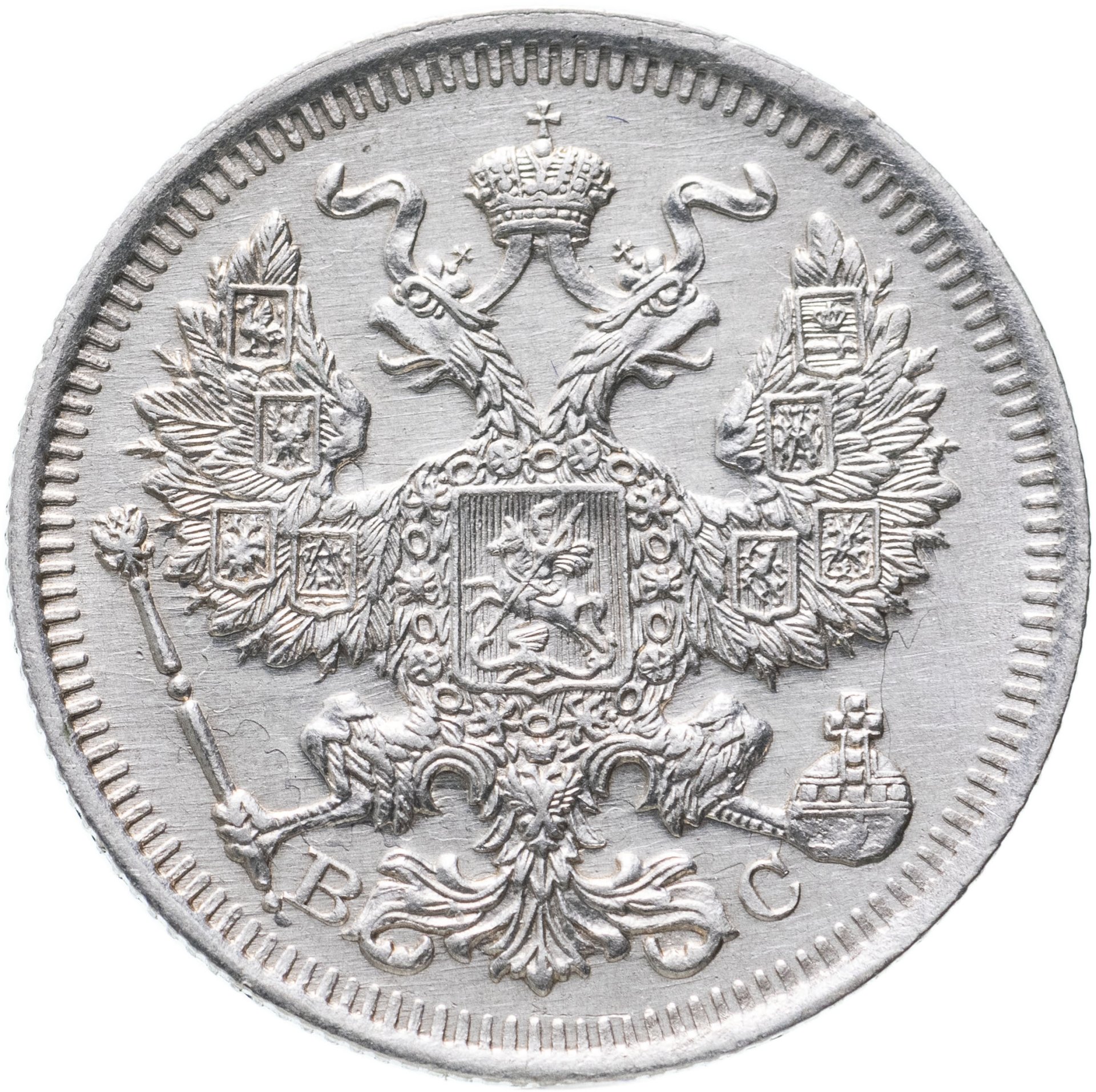 В центре изображен Малый Государственный Герб Российской империи - двуглавый орёл, головы которого увенчаны двумя коронами, третья, большая корона над ними. Все они соединены орденской лентой ордена Св. Апостола Андрея Первозванного. На груди орла расположен Московский герб - щит с изображением Георгия Победоносца, поражающего копьем дракона. Вокруг щита цепь ордена Св. Апостола Андрея Первозванного. На крыльях изображены гербы: Царства Казанского, Польского, Херсонеса Таврического, Астраханского, Сибирского, Грузинского и герб соединенных княжеств Киевского, Новгородского и Владимирского — по 4 на каждое крыло. В правой лапе орла – скипетр, в левой – держава. Под правой лапой – буква «В», под левой – буква «С». Инициалы минцмейстера Виктора Смирнова. По окружности канта имеются рельефные элементы, выполненные в виде зубцов.