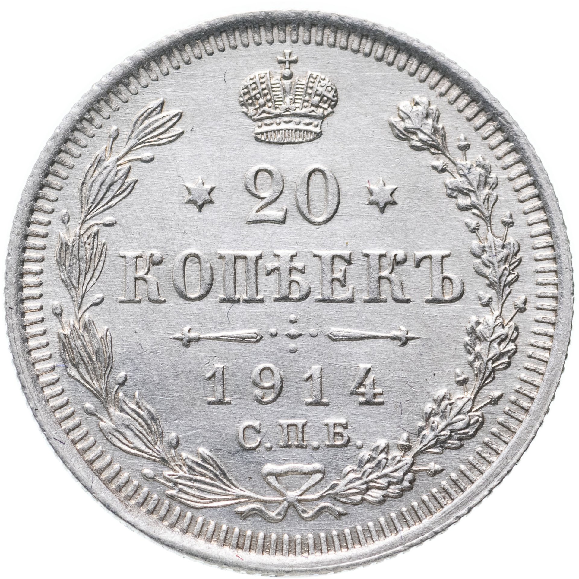 В центре указан номинал - цифра «20», ограниченная с обеих сторон звездочками. Над цифрой – Корона Российской империи. Под цифрой номинала — слово "КОПЕЕК". Ниже, расположен декоративный разделитель в виде двух разнонаправленных фигурных линий и стилизованным из точек крестом между ними. Под разделителем — дата выпуска монеты «1914». Под цифрой даты — обозначение монетного двора «С.П.Б.». Вдоль канта, не доходя до короны, изображен венок из лавровой и дубовой ветвей, которые, в нижней части, перевязаны лентой на узел бантом. По окружности канта имеются рельефные элементы, выполненные в виде зубцов.