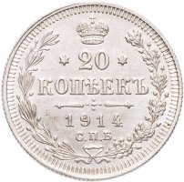 В центре указан номинал - цифра «20», ограниченная с обеих сторон звездочками. Над цифрой – Корона Российской империи. Под цифрой номинала — слово "КОПЕЕК". Ниже, расположен декоративный разделитель в виде двух разнонаправленных фигурных линий и стилизованным из точек крестом между ними. Под разделителем — дата выпуска монеты «1914». Под цифрой даты — обозначение монетного двора «С.П.Б.». Вдоль канта, не доходя до короны, изображен венок из лавровой и дубовой ветвей, которые, в нижней части, перевязаны лентой на узел бантом. По окружности канта имеются рельефные элементы, выполненные в виде зубцов.