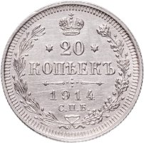 В центре указан номинал - цифра «20», ограниченная с обеих сторон звездочками. Над цифрой – Корона Российской империи. Под цифрой номинала — слово "КОПЕЕК". Ниже, расположен декоративный разделитель в виде двух разнонаправленных фигурных линий и стилизованным из точек крестом между ними. Под разделителем — дата выпуска монеты «1914». Под цифрой даты — обозначение монетного двора «С.П.Б.». Вдоль канта, не доходя до короны, изображен венок из лавровой и дубовой ветвей, которые, в нижней части, перевязаны лентой на узел бантом. По окружности канта имеются рельефные элементы, выполненные в виде зубцов.