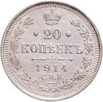 В центре указан номинал - цифра «20», ограниченная с обеих сторон звездочками. Над цифрой – Корона Российской империи. Под цифрой номинала — слово "КОПЕЕК". Ниже, расположен декоративный разделитель в виде двух разнонаправленных фигурных линий и стилизованным из точек крестом между ними. Под разделителем — дата выпуска монеты «1914». Под цифрой даты — обозначение монетного двора «С.П.Б.». Вдоль канта, не доходя до короны, изображен венок из лавровой и дубовой ветвей, которые, в нижней части, перевязаны лентой на узел бантом. По окружности канта имеются рельефные элементы, выполненные в виде зубцов.