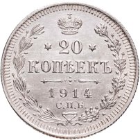 В центре указан номинал - цифра «20», ограниченная с обеих сторон звездочками. Над цифрой – Корона Российской империи. Под цифрой номинала — слово "КОПЕЕК". Ниже, расположен декоративный разделитель в виде двух разнонаправленных фигурных линий и стилизованным из точек крестом между ними. Под разделителем — дата выпуска монеты «1914». Под цифрой даты — обозначение монетного двора «С.П.Б.». Вдоль канта, не доходя до короны, изображен венок из лавровой и дубовой ветвей, которые, в нижней части, перевязаны лентой на узел бантом. По окружности канта имеются рельефные элементы, выполненные в виде зубцов.