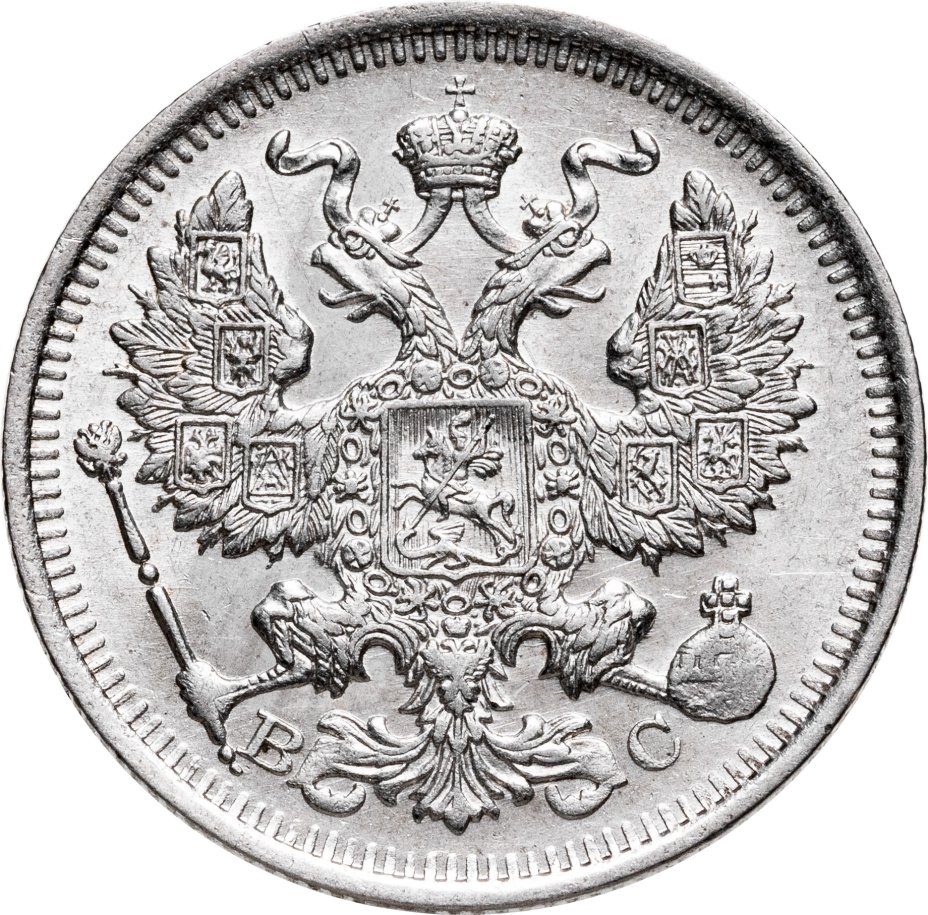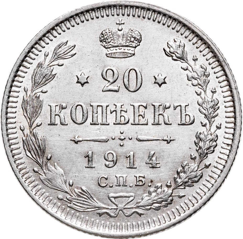 В центре указан номинал - цифра «20», ограниченная с обеих сторон звездочками. Над цифрой – Корона Российской империи. Под цифрой номинала — слово "КОПЕЕК". Ниже, расположен декоративный разделитель в виде двух разнонаправленных фигурных линий и стилизованным из точек крестом между ними. Под разделителем — дата выпуска монеты «1914». Под цифрой даты — обозначение монетного двора «С.П.Б.». Вдоль канта, не доходя до короны, изображен венок из лавровой и дубовой ветвей, которые, в нижней части, перевязаны лентой на узел бантом. По окружности канта имеются рельефные элементы, выполненные в виде зубцов.