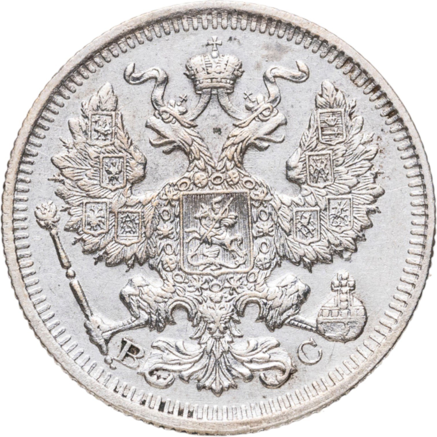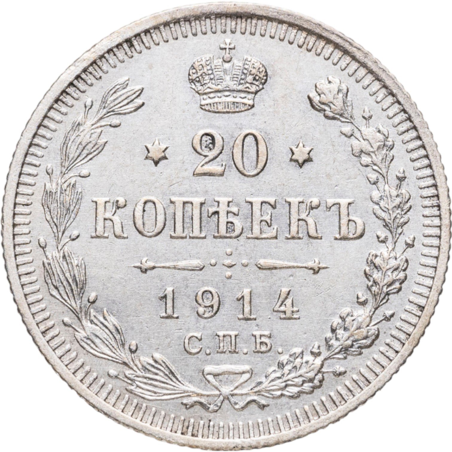 В центре указан номинал - цифра «20», ограниченная с обеих сторон звездочками. Над цифрой – Корона Российской империи. Под цифрой номинала — слово "КОПЕЕК". Ниже, расположен декоративный разделитель в виде двух разнонаправленных фигурных линий и стилизованным из точек крестом между ними. Под разделителем — дата выпуска монеты «1914». Под цифрой даты — обозначение монетного двора «С.П.Б.». Вдоль канта, не доходя до короны, изображен венок из лавровой и дубовой ветвей, которые, в нижней части, перевязаны лентой на узел бантом. По окружности канта имеются рельефные элементы, выполненные в виде зубцов.
