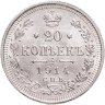 В центре указан номинал - цифра «20», ограниченная с обеих сторон звездочками. Над цифрой – Корона Российской империи. Под цифрой номинала — слово "КОПЕЕК". Ниже, расположен декоративный разделитель в виде двух разнонаправленных фигурных линий и стилизованным из точек крестом между ними. Под разделителем — дата выпуска монеты «1914». Под цифрой даты — обозначение монетного двора «С.П.Б.». Вдоль канта, не доходя до короны, изображен венок из лавровой и дубовой ветвей, которые, в нижней части, перевязаны лентой на узел бантом. По окружности канта имеются рельефные элементы, выполненные в виде зубцов.