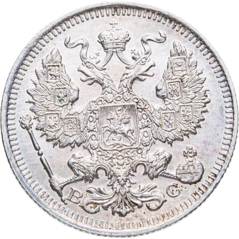 В центре указан номинал - цифра «20», ограниченная с обеих сторон звездочками. Над цифрой – Корона Российской империи. Под цифрой номинала — слово "КОПЕЕК". Ниже, расположен декоративный разделитель в виде двух разнонаправленных фигурных линий и стилизованным из точек крестом между ними. Под разделителем — дата выпуска монеты «1914». Под цифрой даты — обозначение монетного двора «С.П.Б.». Вдоль канта, не доходя до короны, изображен венок из лавровой и дубовой ветвей, которые, в нижней части, перевязаны лентой на узел бантом. По окружности канта имеются рельефные элементы, выполненные в виде зубцов.