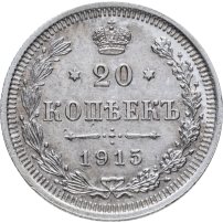 В центре указан номинал - цифра «20», ограниченная с обеих сторон звездочками. Над цифрой – Корона Российской империи. Под цифрой номинала — слово "КОПЕЕК". Ниже, расположен декоративный разделитель в виде двух разнонаправленных фигурных линий и стилизованным из точек крестом между ними. Под разделителем — дата выпуска монеты «1915». Вдоль канта, не доходя до короны, изображен венок из лавровой и дубовой ветвей, которые, в нижней части, перевязаны лентой на узел бантом. По окружности канта имеются рельефные элементы, выполненные в виде зубцов.