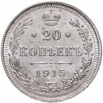 В центре указан номинал - цифра «20», ограниченная с обеих сторон звездочками. Над цифрой – Корона Российской империи. Под цифрой номинала — слово "КОПЕЕК". Ниже, расположен декоративный разделитель в виде двух разнонаправленных фигурных линий и стилизованным из точек крестом между ними. Под разделителем — дата выпуска монеты «1915». Вдоль канта, не доходя до короны, изображен венок из лавровой и дубовой ветвей, которые, в нижней части, перевязаны лентой на узел бантом. По окружности канта имеются рельефные элементы, выполненные в виде зубцов.