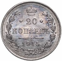В центре указан номинал - цифра «20», ограниченная с обеих сторон звездочками. Над цифрой – Корона Российской империи. Под цифрой номинала — слово "КОПЕЕК". Ниже, расположен декоративный разделитель в виде двух разнонаправленных фигурных линий и стилизованным из точек крестом между ними. Под разделителем — дата выпуска монеты «1915». Вдоль канта, не доходя до короны, изображен венок из лавровой и дубовой ветвей, которые, в нижней части, перевязаны лентой на узел бантом. По окружности канта имеются рельефные элементы, выполненные в виде зубцов.