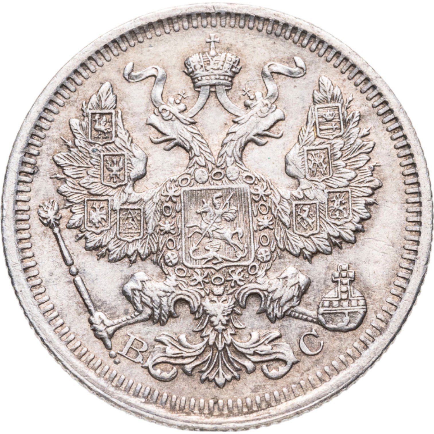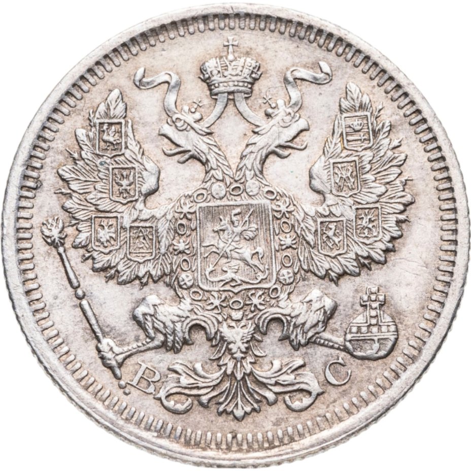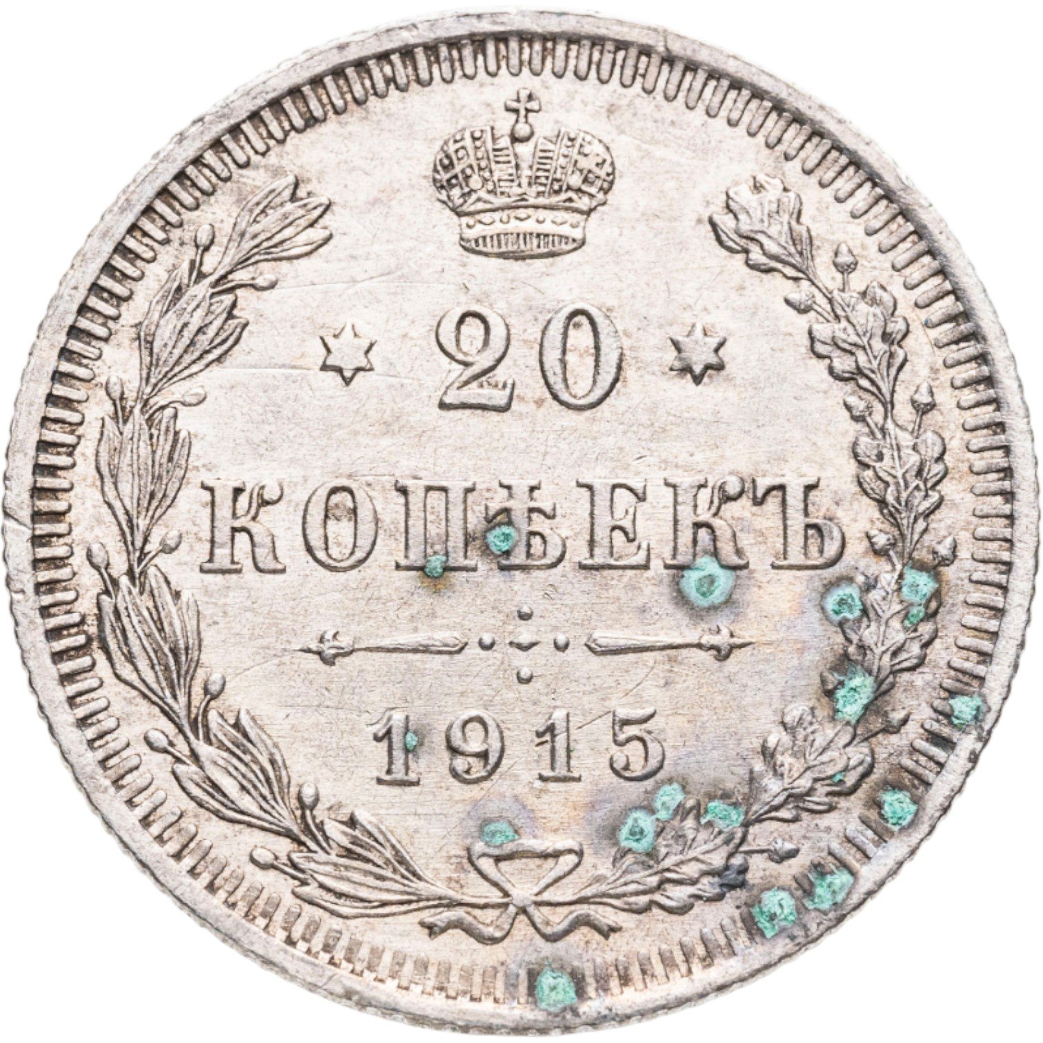 В центре указан номинал - цифра «20», ограниченная с обеих сторон звездочками. Над цифрой – Корона Российской империи. Под цифрой номинала — слово "КОПЕЕК". Ниже, расположен декоративный разделитель в виде двух разнонаправленных фигурных линий и стилизованным из точек крестом между ними. Под разделителем — дата выпуска монеты «1915». Вдоль канта, не доходя до короны, изображен венок из лавровой и дубовой ветвей, которые, в нижней части, перевязаны лентой на узел бантом. По окружности канта имеются рельефные элементы, выполненные в виде зубцов.