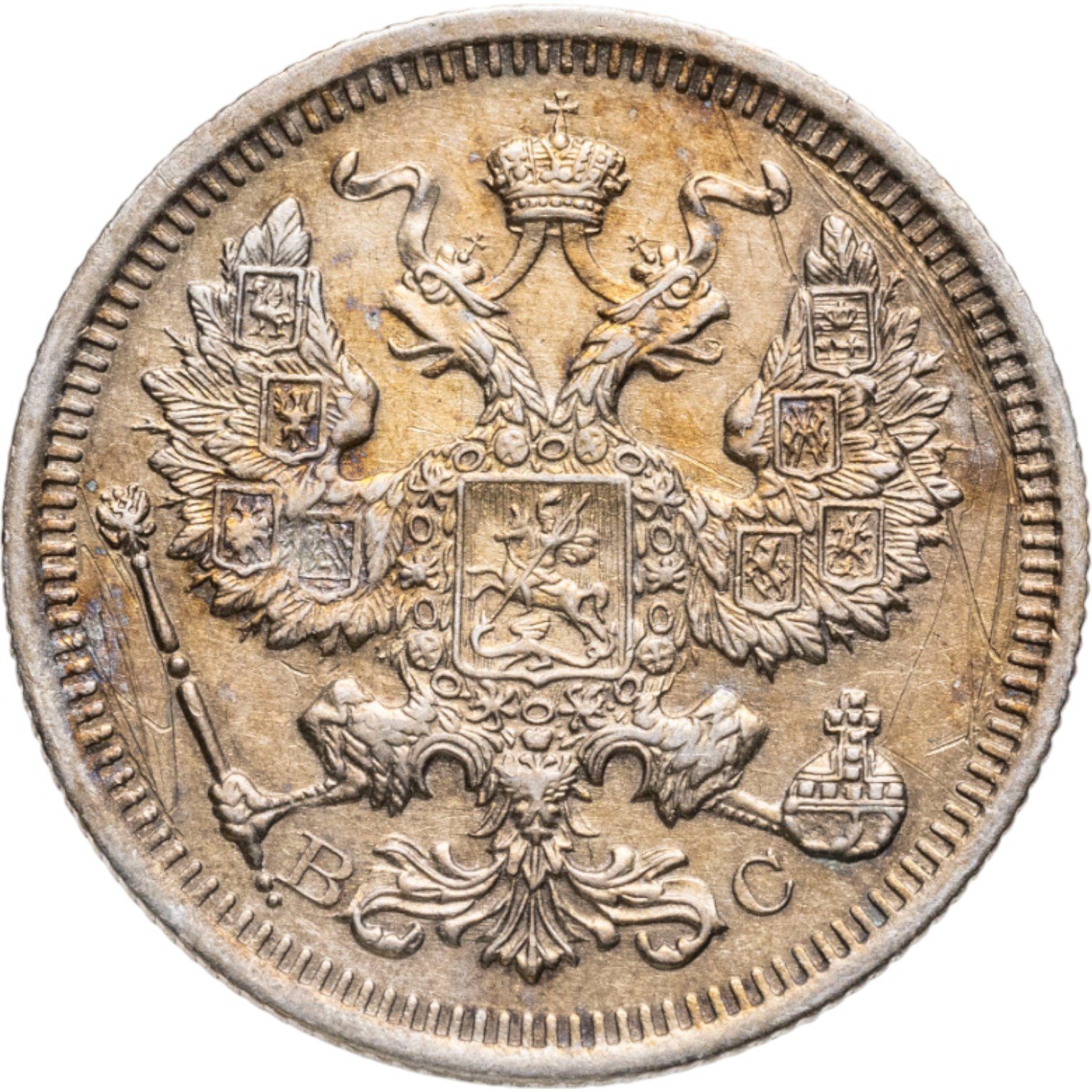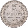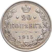 В центре указан номинал - цифра «20», ограниченная с обеих сторон звездочками. Над цифрой – Корона Российской империи. Под цифрой номинала — слово "КОПЕЕК". Ниже, расположен декоративный разделитель в виде двух разнонаправленных фигурных линий и стилизованным из точек крестом между ними. Под разделителем — дата выпуска монеты «1915». Вдоль канта, не доходя до короны, изображен венок из лавровой и дубовой ветвей, которые, в нижней части, перевязаны лентой на узел бантом. По окружности канта имеются рельефные элементы, выполненные в виде зубцов.