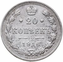 В центре указан номинал - цифра «20», ограниченная с обеих сторон звездочками. Над цифрой – Корона Российской империи. Под цифрой номинала — слово "КОПЕЕК". Ниже, расположен декоративный разделитель в виде двух разнонаправленных фигурных линий и стилизованным из точек крестом между ними. Под разделителем — дата выпуска монеты «1916». Вдоль канта, не доходя до короны, изображен венок из лавровой и дубовой ветвей, которые, в нижней части, перевязаны лентой на узел бантом. По окружности канта имеются рельефные элементы, выполненные в виде зубцов.