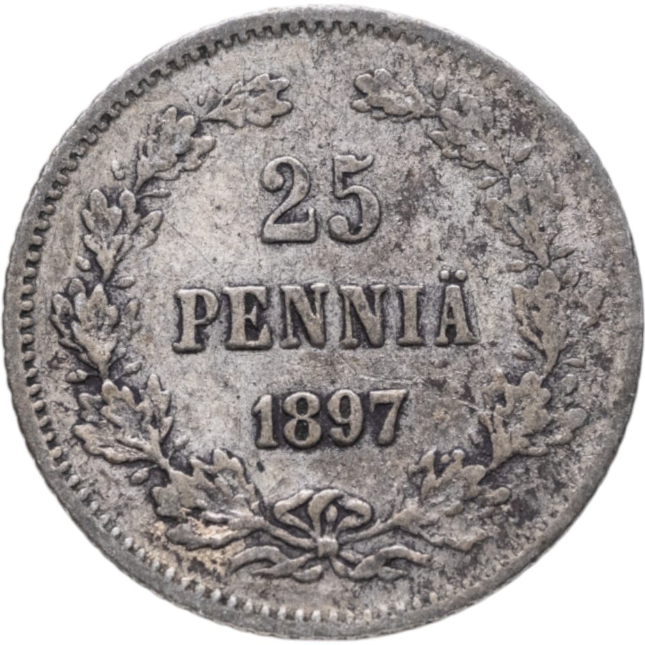 В центре - надпись в три строки: «25»│«PENNIÄ»│«1897». Вдоль канта изображён не замкнутый венок из двух дубовых ветвей, которые, в нижней части, перевязаны лентой на узел двойным бантом. По окружности канта имеются рельефные элементы, выполненные в виде зубцов.