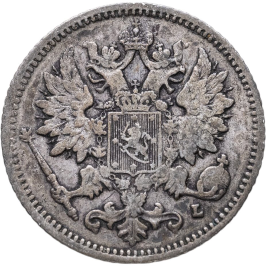 В центре изображён полный Герб Великого княжества Финляндского - двуглавый орёл, головы которого увенчаны двумя коронами, третья, большая корона над ними. Все они соединены орденской лентой ордена Св. Апостола Андрея Первозванного. На груди орла расположен щит с титульным гербом Великого князя Финляндского, увенчанный княжеской короной. Вокруг щита орденская цепь с орденом Св. Апостола Андрея Первозванного. В правой лапе орла – скипетр, в левой – держава. Под левой лапой знак директора Гельсингфосского монетного двора - литера «L», Johan Conrad Lihr (Йохан Конрад Лир). По окружности канта имеются рельефные элементы, выполненные в виде зубцов.