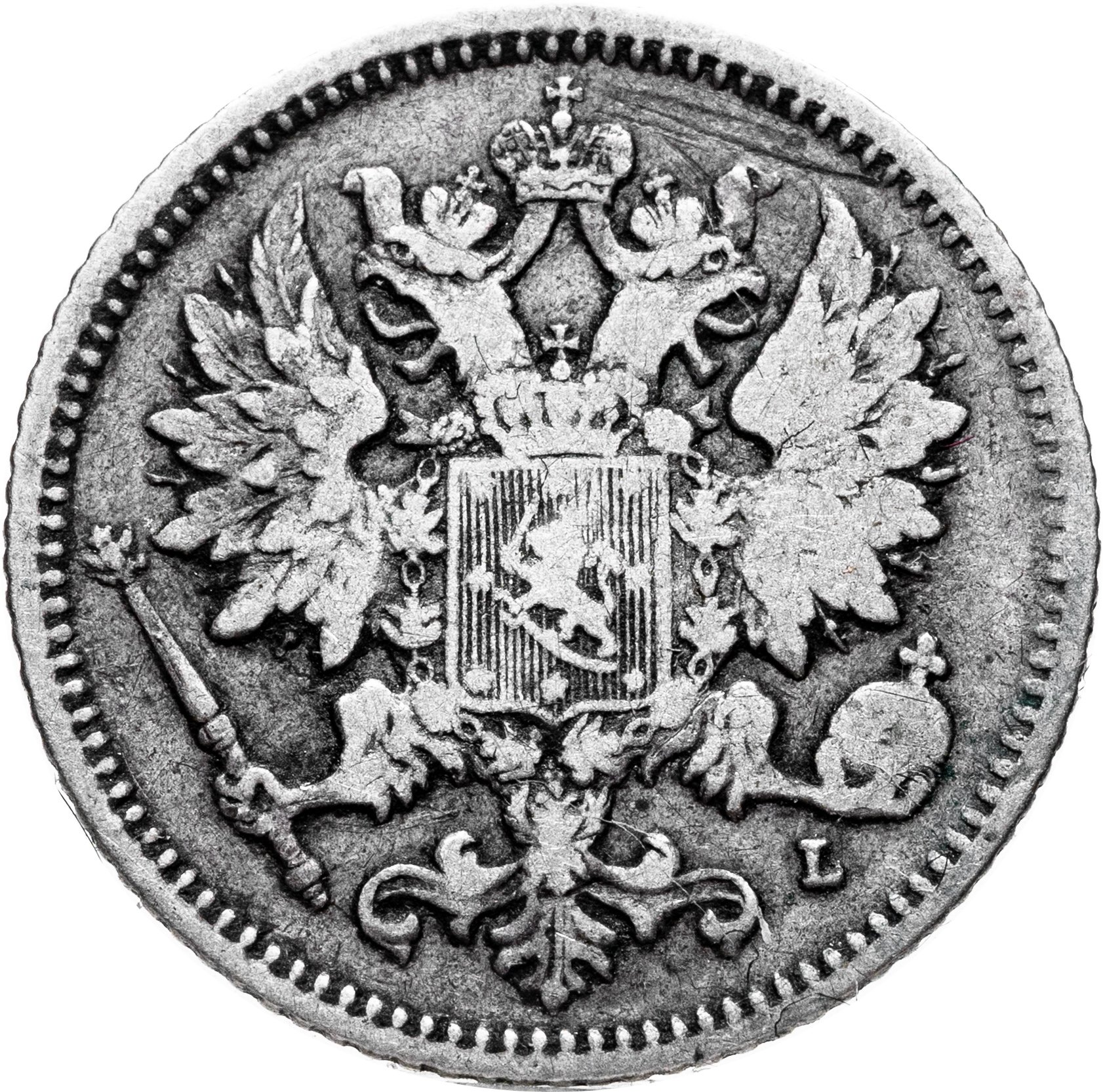 В центре изображён полный Герб Великого княжества Финляндского - двуглавый орёл, головы которого увенчаны двумя коронами, третья, большая корона над ними. Все они соединены орденской лентой ордена Св. Апостола Андрея Первозванного. На груди орла расположен щит с титульным гербом Великого князя Финляндского, увенчанный княжеской короной. Вокруг щита орденская цепь с орденом Св. Апостола Андрея Первозванного. В правой лапе орла – скипетр, в левой – держава. Под левой лапой знак директора Гельсингфосского монетного двора - литера «L», Johan Conrad Lihr (Йохан Конрад Лир). По окружности канта имеются рельефные элементы, выполненные в виде зубцов.