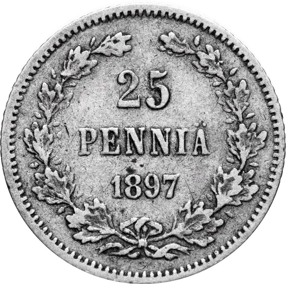 В центре - надпись в три строки: «25»│«PENNIÄ»│«1897». Вдоль канта изображён не замкнутый венок из двух дубовых ветвей, которые, в нижней части, перевязаны лентой на узел двойным бантом. По окружности канта имеются рельефные элементы, выполненные в виде зубцов.