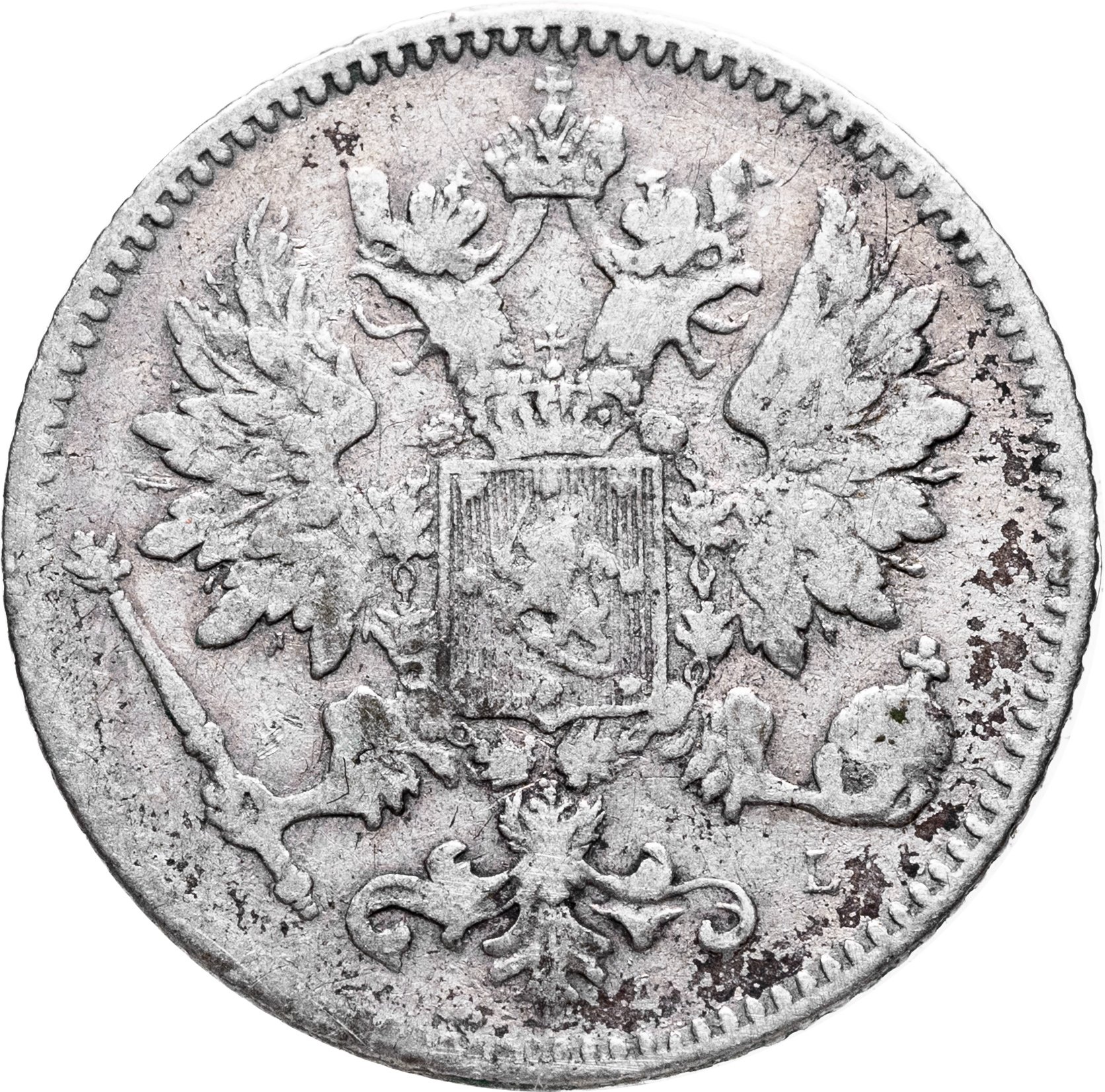 В центре изображён полный Герб Великого княжества Финляндского - двуглавый орёл, головы которого увенчаны двумя коронами, третья, большая корона над ними. Все они соединены орденской лентой ордена Св. Апостола Андрея Первозванного. На груди орла расположен щит с титульным гербом Великого князя Финляндского, увенчанный княжеской короной. Вокруг щита орденская цепь с орденом Св. Апостола Андрея Первозванного. В правой лапе орла – скипетр, в левой – держава. Под левой лапой знак директора Гельсингфосского монетного двора - литера «L», Johan Conrad Lihr (Йохан Конрад Лир). По окружности канта имеются рельефные элементы, выполненные в виде зубцов.