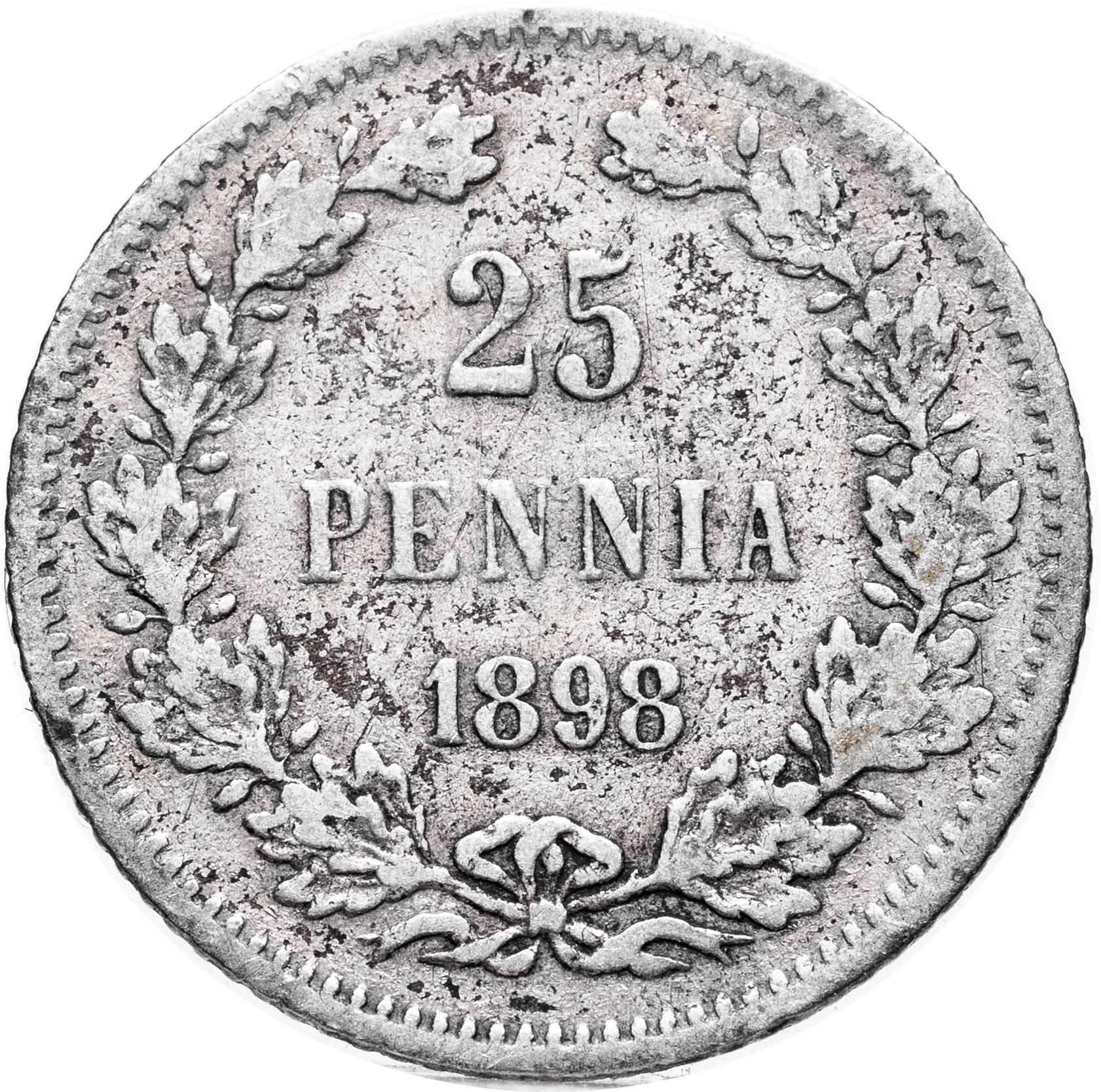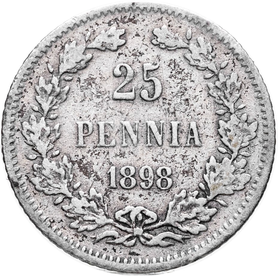 В центре - надпись в три строки: «25»│«PENNIÄ»│«1898». Вдоль канта изображён не замкнутый венок из двух дубовых ветвей, которые, в нижней части, перевязаны лентой на узел двойным бантом. По окружности канта имеются рельефные элементы, выполненные в виде зубцов.