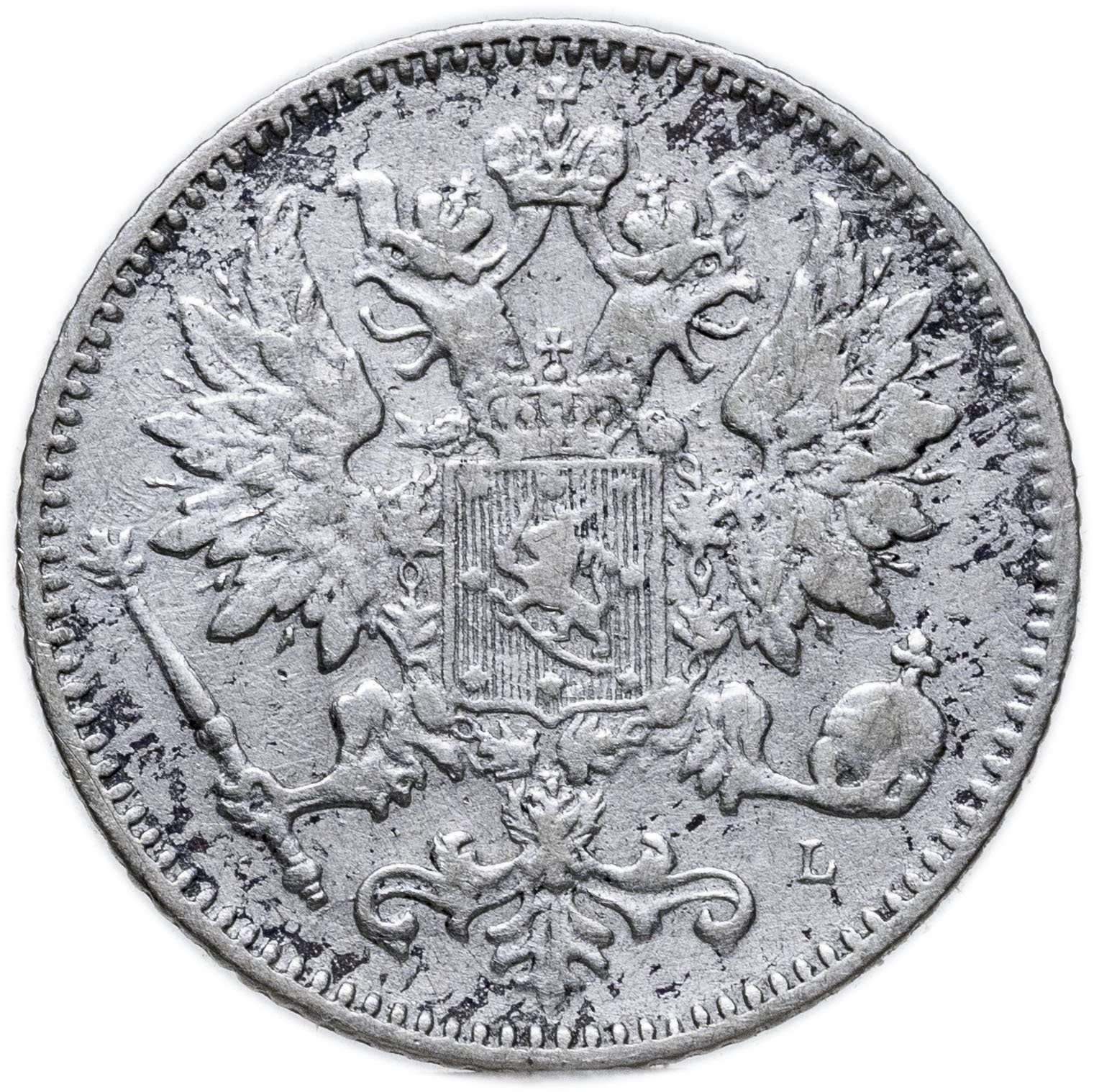 В центре изображён полный Герб Великого княжества Финляндского - двуглавый орёл, головы которого увенчаны двумя коронами, третья, большая корона над ними. Все они соединены орденской лентой ордена Св. Апостола Андрея Первозванного. На груди орла расположен щит с титульным гербом Великого князя Финляндского, увенчанный княжеской короной. Вокруг щита орденская цепь с орденом Св. Апостола Андрея Первозванного. В правой лапе орла – скипетр, в левой – держава. Под левой лапой знак директора Гельсингфосского монетного двора - литера «L», Johan Conrad Lihr (Йохан Конрад Лир). По окружности канта имеются рельефные элементы, выполненные в виде зубцов.