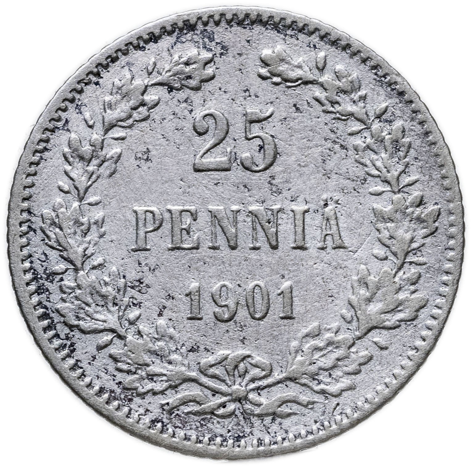 В центре - надпись в три строки: «25»│«PENNIÄ»│«1901». Вдоль канта изображён не замкнутый венок из двух дубовых ветвей, которые, в нижней части, перевязаны лентой на узел двойным бантом. По окружности канта имеются рельефные элементы, выполненные в виде зубцов.