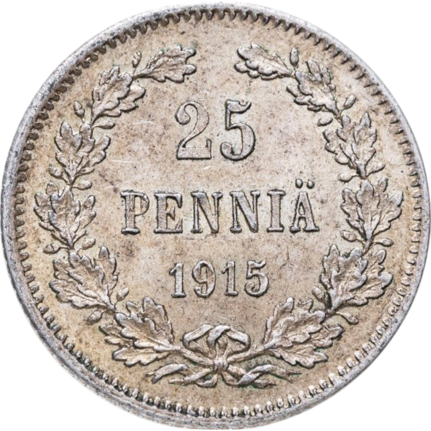 В центре - надпись в три строки: «25»│«PENNIÄ»│«1915». Вдоль канта изображён не замкнутый венок из двух дубовых ветвей, которые, в нижней части, перевязаны лентой на узел двойным бантом. По окружности канта имеются рельефные элементы, выполненные в виде зубцов.