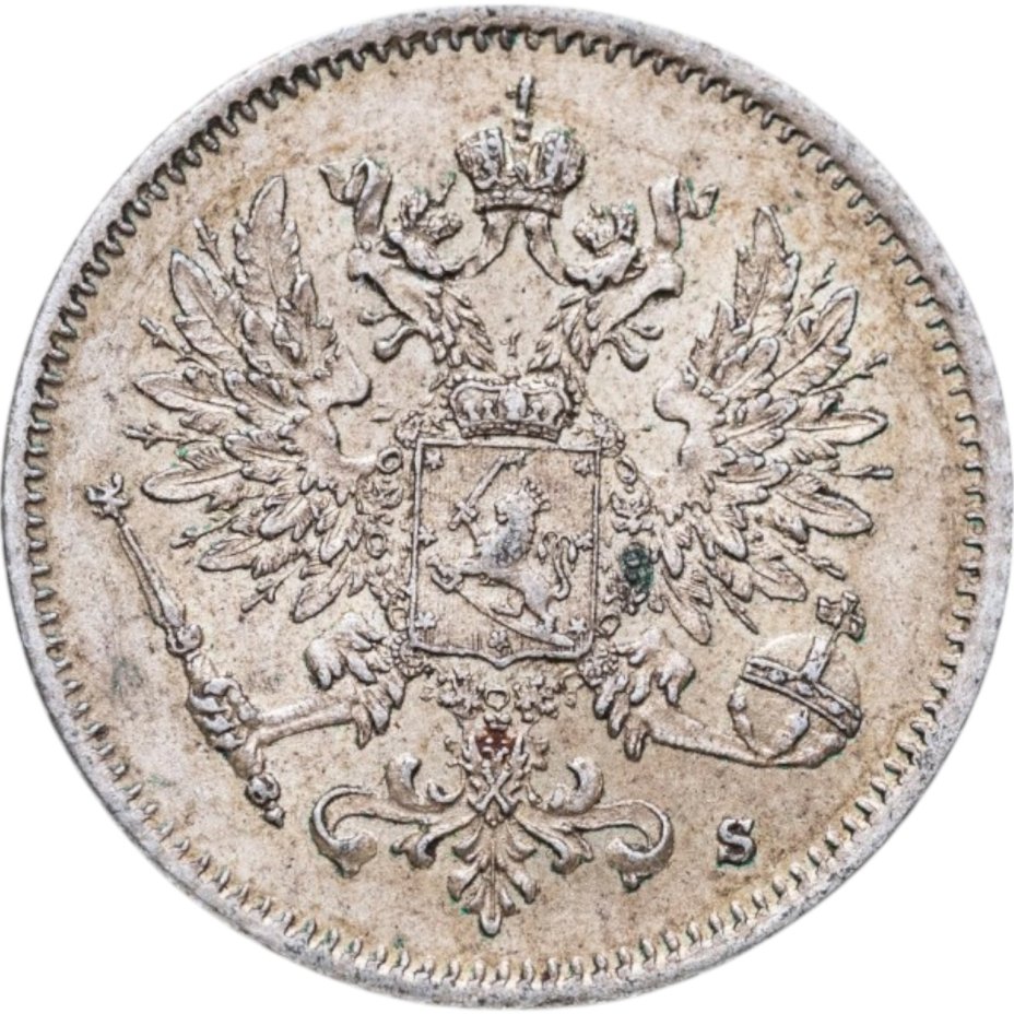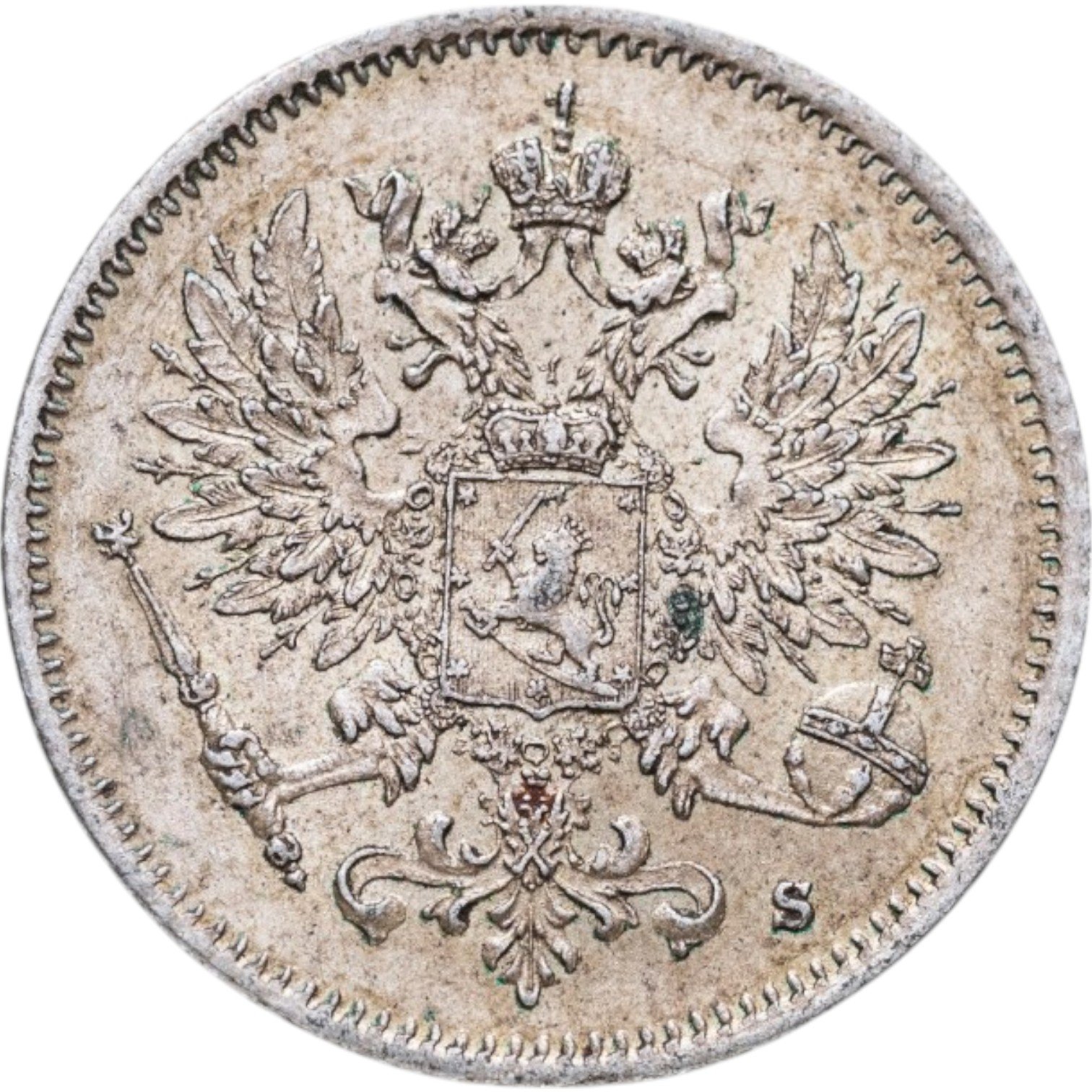 В центре изображён полный Герб Великого княжества Финляндского - двуглавый орёл, головы которого увенчаны двумя коронами, третья, большая корона над ними. Все они соединены орденской лентой ордена Св. Апостола Андрея Первозванного. На груди орла расположен щит с титульным гербом Великого князя Финляндского, увенчанный княжеской короной. Вокруг щита орденская цепь с орденом Св. Апостола Андрея Первозванного. В правой лапе орла – скипетр, в левой – держава. Под левой лапой знак директора Гельсингфосского монетного двора - литера «S», Isak Gustaf Sundell (Исаак Густаф Сундель). По окружности канта имеются рельефные элементы, выполненные в виде зубцов.