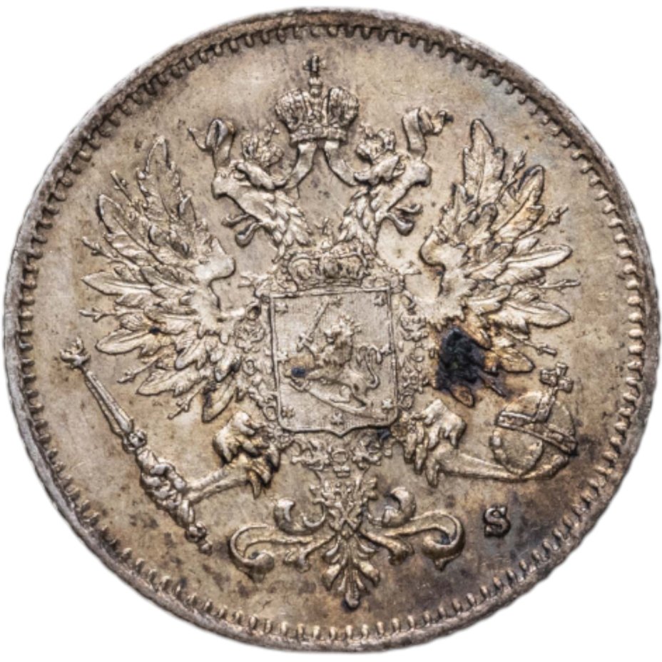 В центре изображён полный Герб Великого княжества Финляндского - двуглавый орёл, головы которого увенчаны двумя коронами, третья, большая корона над ними. Все они соединены орденской лентой ордена Св. Апостола Андрея Первозванного. На груди орла расположен щит с титульным гербом Великого князя Финляндского, увенчанный княжеской короной. Вокруг щита орденская цепь с орденом Св. Апостола Андрея Первозванного. В правой лапе орла – скипетр, в левой – держава. Под левой лапой знак директора Гельсингфосского монетного двора - литера «S», Isak Gustaf Sundell (Исаак Густаф Сундель). По окружности канта имеются рельефные элементы, выполненные в виде зубцов.
