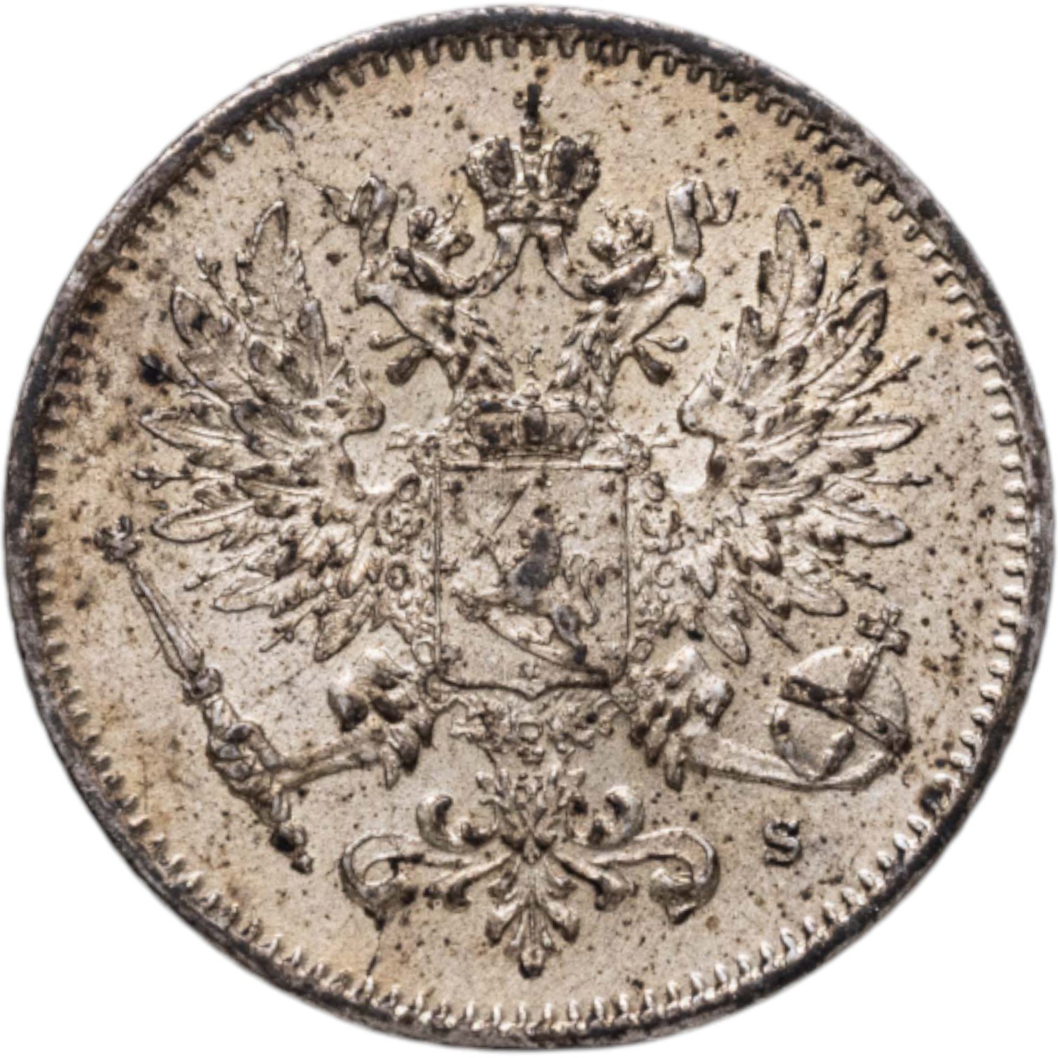 В центре изображён полный Герб Великого княжества Финляндского - двуглавый орёл, головы которого увенчаны двумя коронами, третья, большая корона над ними. Все они соединены орденской лентой ордена Св. Апостола Андрея Первозванного. На груди орла расположен щит с титульным гербом Великого князя Финляндского, увенчанный княжеской короной. Вокруг щита орденская цепь с орденом Св. Апостола Андрея Первозванного. В правой лапе орла – скипетр, в левой – держава. Под левой лапой знак директора Гельсингфосского монетного двора - литера «S», Isak Gustaf Sundell (Исаак Густаф Сундель). По окружности канта имеются рельефные элементы, выполненные в виде зубцов.