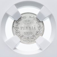 В центре - надпись в три строки: «25»│«PENNIÄ»│«1916». Вдоль канта изображён не замкнутый венок из двух дубовых ветвей, которые, в нижней части, перевязаны лентой на узел двойным бантом. По окружности канта имеются рельефные элементы, выполненные в виде зубцов.