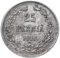 В центре - надпись в три строки: «25»│«PENNIÄ»│«1916». Вдоль канта изображён не замкнутый венок из двух дубовых ветвей, которые, в нижней части, перевязаны лентой на узел двойным бантом. По окружности канта имеются рельефные элементы, выполненные в виде зубцов.