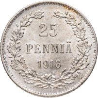 В центре - надпись в три строки: «25»│«PENNIÄ»│«1916». Вдоль канта изображён не замкнутый венок из двух дубовых ветвей, которые, в нижней части, перевязаны лентой на узел двойным бантом. По окружности канта имеются рельефные элементы, выполненные в виде зубцов.