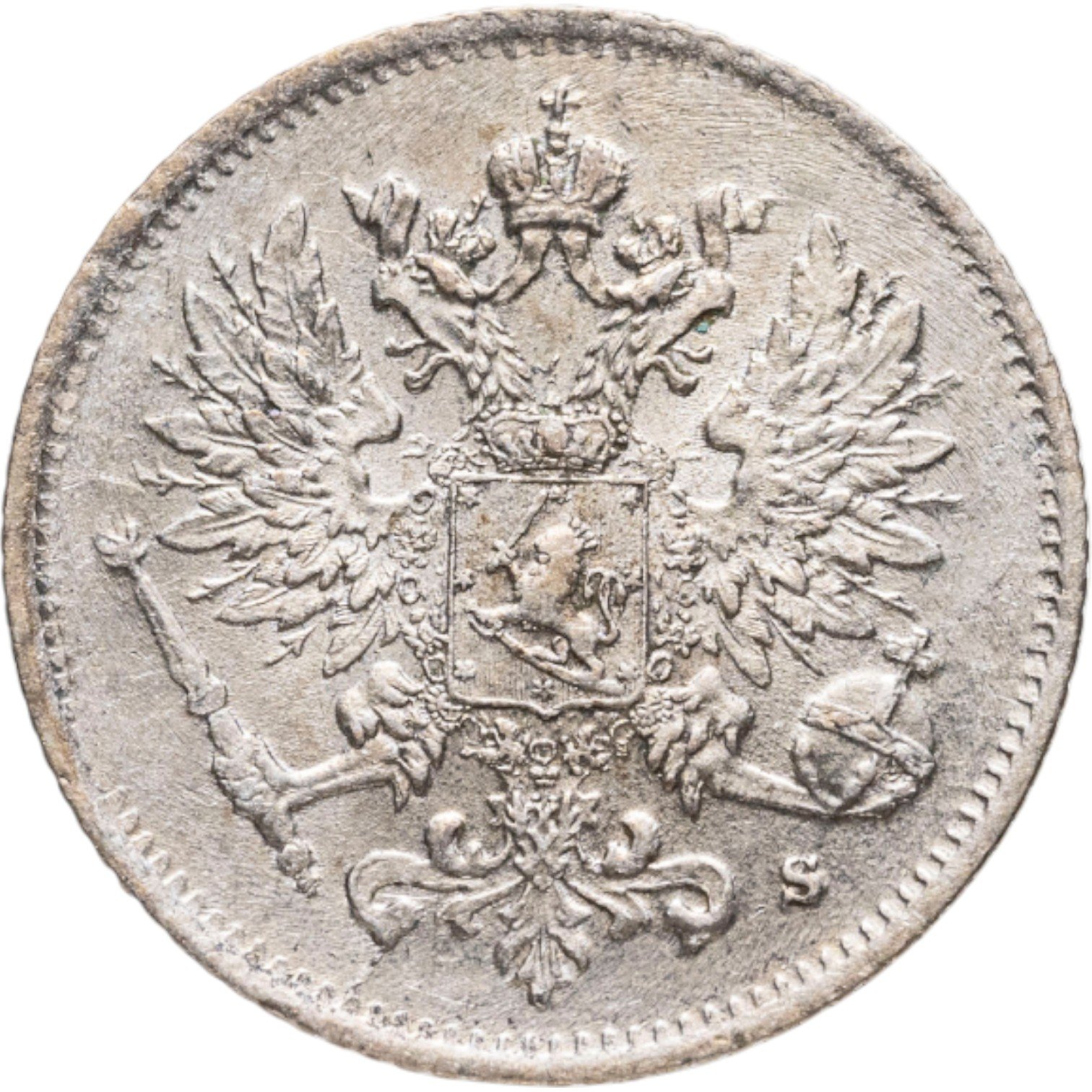 В центре изображён полный Герб Великого княжества Финляндского - двуглавый орёл, головы которого увенчаны двумя коронами, третья, большая корона над ними. Все они соединены орденской лентой ордена Св. Апостола Андрея Первозванного. На груди орла расположен щит с титульным гербом Великого князя Финляндского, увенчанный княжеской короной. Вокруг щита орденская цепь с орденом Св. Апостола Андрея Первозванного. В правой лапе орла – скипетр, в левой – держава. Под левой лапой знак директора Гельсингфосского монетного двора - литера «S», Isak Gustaf Sundell (Исаак Густаф Сундель). По окружности канта имеются рельефные элементы, выполненные в виде зубцов.