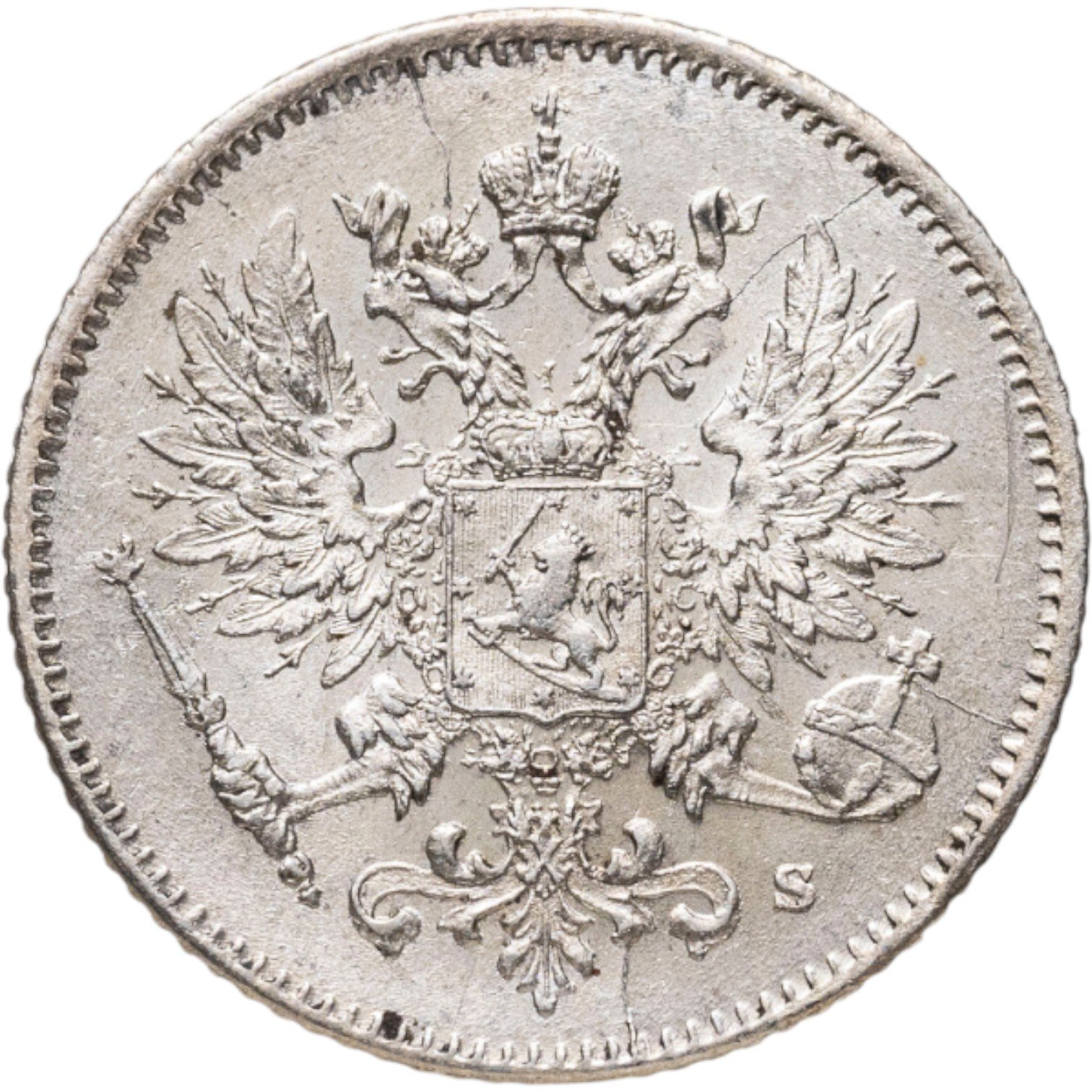 В центре изображён полный Герб Великого княжества Финляндского - двуглавый орёл, головы которого увенчаны двумя коронами, третья, большая корона над ними. Все они соединены орденской лентой ордена Св. Апостола Андрея Первозванного. На груди орла расположен щит с титульным гербом Великого князя Финляндского, увенчанный княжеской короной. Вокруг щита орденская цепь с орденом Св. Апостола Андрея Первозванного. В правой лапе орла – скипетр, в левой – держава. Под левой лапой знак директора Гельсингфосского монетного двора - литера «S», Isak Gustaf Sundell (Исаак Густаф Сундель). По окружности канта имеются рельефные элементы, выполненные в виде зубцов.