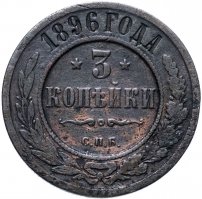 В центре указан номинал — цифра «3», ограниченная с обеих сторон звездочками. Под цифрой номинала — слово "КОПЕЙКИ". Ниже, расположен декоративный разделитель в виде двух изогнутых линий и небольшой окружности между ними. Под разделителем — обозначение монетного двора «С.П.Б.». Центральная часть отделена от остального изображения, окружностью в виде точек. В верхней части полукругом углубленная надпись: "1896 ГОДА". Ниже этой надписи, вдоль канта, изображен венок из лавровой и дубовой ветвей, которые, в нижней части, перевязаны лентой на узел бантом.
