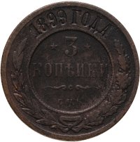 В центре указан номинал — цифра «3», ограниченная с обеих сторон звездочками. Под цифрой номинала — слово "КОПЕЙКИ". Ниже, расположен декоративный разделитель в виде двух изогнутых линий и небольшой окружности между ними. Под разделителем — обозначение монетного двора «С.П.Б.». Центральная часть отделена от остального изображения, окружностью в виде точек. В верхней части полукругом углубленная надпись: "1899 ГОДА". Ниже этой надписи, вдоль канта, изображен венок из лавровой и дубовой ветвей, которые, в нижней части, перевязаны лентой на узел бантом.