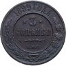 В центре монеты изображен Малый Государственный Герб Российской империи - двуглавый орел, головы которого увенчаны двумя коронами, третья, большая корона над ними. Все они соединены лентой Андрея Первозванного. В правой лапе орла – скипетр, в левой – держава. На его груди расположен Московский герб, в щите изображен Георгий Победоносец с копьем поражающий дракона. Вокруг щита цепь ордена Св. Апостола Андрея Первозванного. На крыльях орла изображены гербы: Царства Казанского, Польского, Херсонеса Таврического, Астраханского, Сибирского, Грузинского и герб соединенных княжеств Киевского, Новгородского и Владимирского — по 4 на каждое крыло. По окружности - две полукруглые плашки, соединенные узорами. На верхней плашке выпуклая надпись: "МЕДНАЯ РОССИЙСКАЯ МОНЕТА". На нижней плашке, изображенной в виде ленты, углубленная надпись: "ТРИ КОПЕЙКИ".